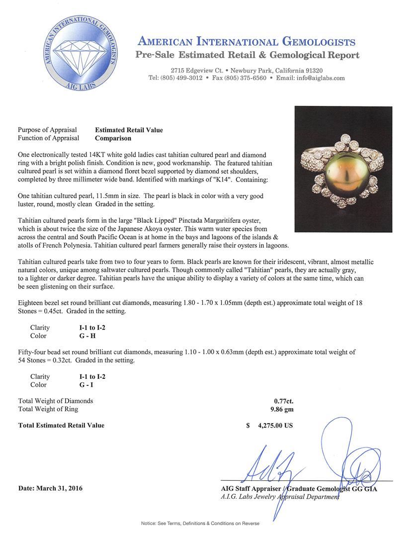 One electronically tested 14KT white gold ladies cast Tahitian cultured pearl and diamond ring with a bright polish finish. The featured Tahitian cultured pearl is set within a diamond floret bezel supported by diamond set shoulders, completed by three millimeter wide band. Identified with markings of "K14". Condition is new, good workmanship. Containing: One Tahitian cultured pearl, 11.5mm in size. The pearl is black in color with a very good luster, round, mostly clean Graded in the setting. Tahitian cultured pearls form in the large "Black Lipped" Pinctada Margaritifera oyster, which is about twice the size of the Japanese Akoya oyster. This warm water species from across the central and South Pacific Ocean is at home in the bays and lagoons of the islands &atolls of French Polynesia. Tahitian cultured pearl farmers generally raise their oysters in lagoons. Tahitian cultured pearls take from two to four years to form. Black pearls are known for their iridescent, vibrant, almost metallic natural colors, unique among saltwater cultured pearls. Though commonly called "Tahitian" pearls, they are actually gray, to a lighter or darker degree. Tahitian pearls have the unique ability to display a variety of colors at the same time, which can be seen glistening on their surface. Eighteen bezel set round brilliant cut diamonds, measuring 1.80 - 1.70 x 1.05mm (depth est.) approximate total weight of 18 Stones = 0.45ct. Graded in the setting. Clarity: I-1 to I-2. Color: G - H Fifty-Four bead set round brilliant cut diamonds, measuring 1.10 - 1.00 x 0.63mm (depth est.) approximate total weight of 54 Stones = 0.32ct. Graded in the setting. Clarity: I-1 to I-2. Color: G - I. Total Weight of Diamonds 0.77ct. Total Weight of Ring 9.86gm. AIG Appraised at $4,275.00.
