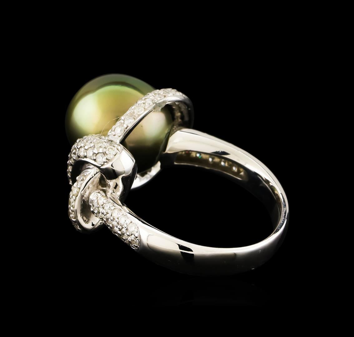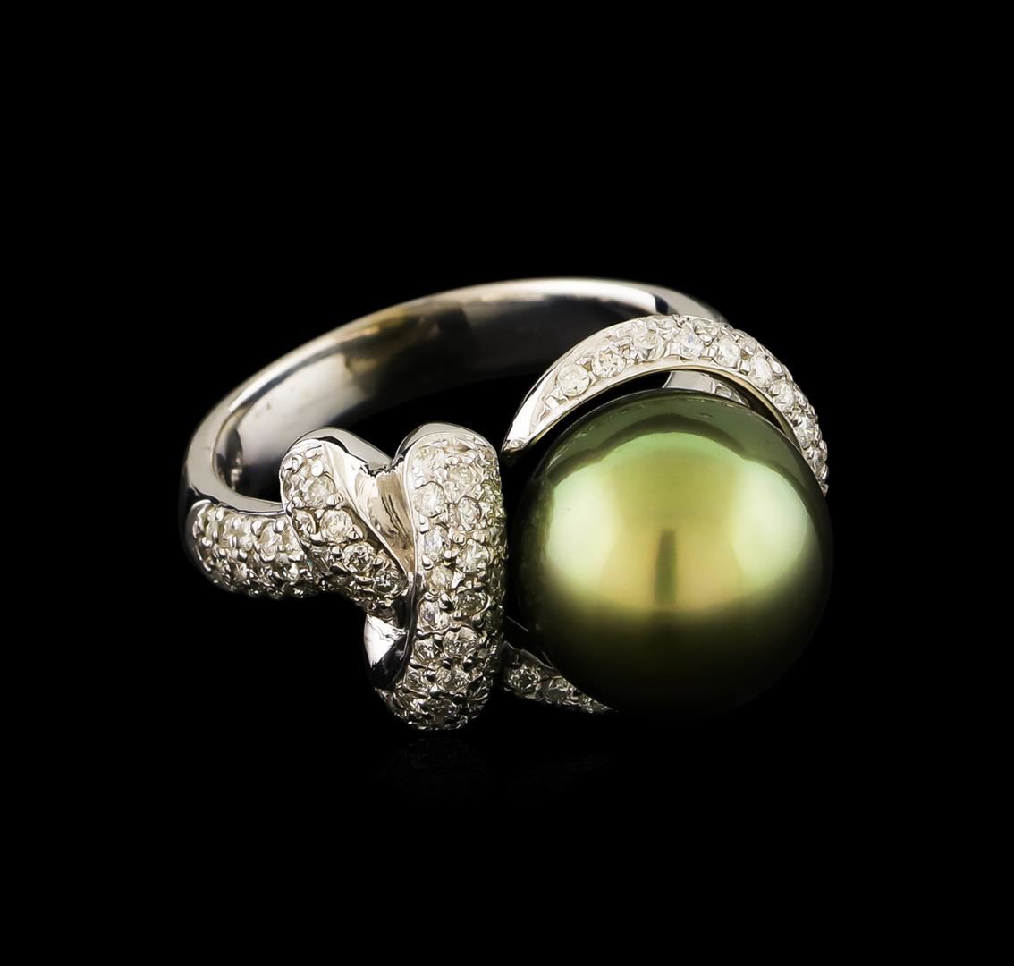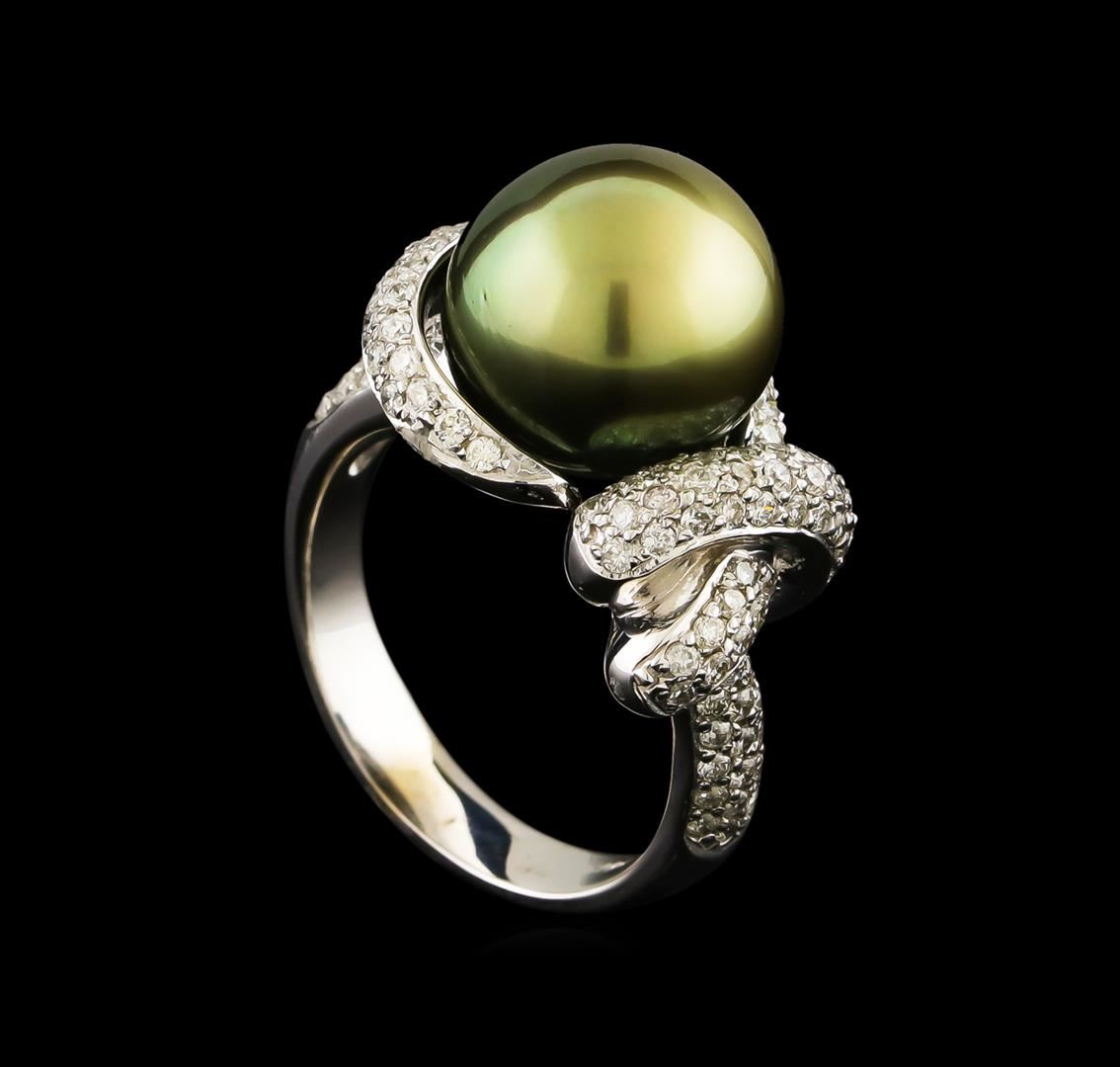 One electronically tested 14KT white gold lady's combination cast & assembled fashion ring with a bypass halo with a bright polish finish. The featured lady's ring has a shank measuring 3.74 millimeters wide. Identified with markings of "14K". Condition is new, good workmanship. Containing: One Tahitian pearl, 11.6mm in size to 11.2mm in size. The pearl is pistachio in color, green overtone with a very good luster, near round, and mostly clean. Graded in the setting. One Hundred Eight prong set round brilliant cut diamonds, measuring 1.30 - 1.20 x 0.78mm (depth est.) approximate total weight of 108 Stones = 0.82ct. Graded in the setting. Clarity: SI-1 to I-1. Color: G - Good. Total Weight of Diamonds 0.82ct. Total Weight of Ring 8.80gm. GAS Appraised at $5,255.00.