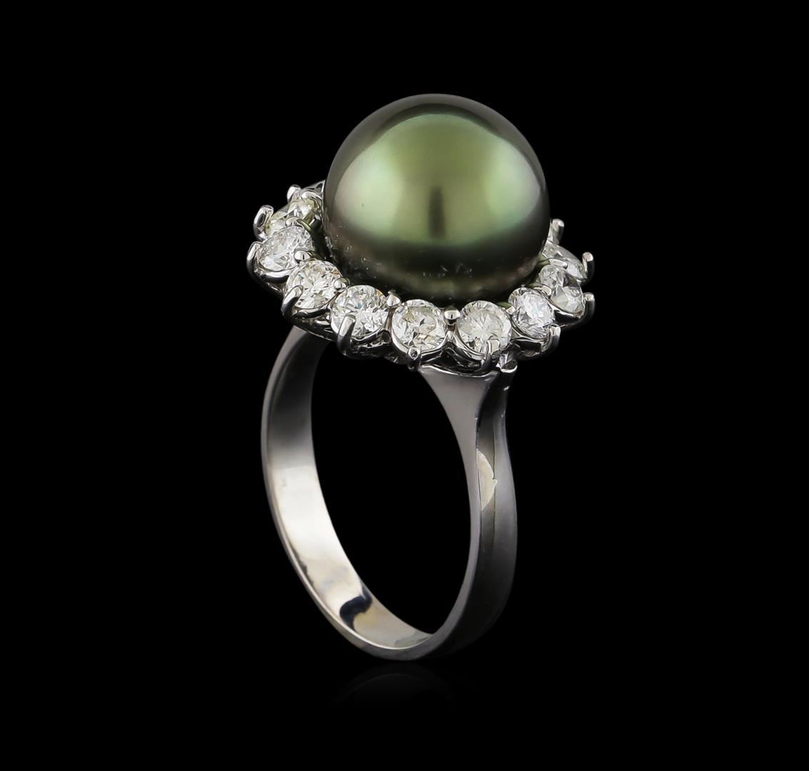 One electronically tested 14KT white gold lady's cast fashion ring with a basket halo with a bright polish finish. The featured lady's ring has a shank measuring 3.20 millimeters wide. Identified with markings of "K14". Condition is new, good workmanship. Containing: One Tahitian pearl, 11.8mm in size to 11.7mm in size. The pearl is black in color, green overtone with a good luster, round, and clean. Graded in the setting. Fourteen prong set round brilliant cut diamonds, measuring 3.05 - 2.95 x 1.86mm (depth est.) approximate total weight of 14 Stones = 1.43ct. Graded in the setting. Clarity: SI-1 to I-1. Color: H - I. Cut Good. Total Weight of Diamonds 1.43ct. Total Weight of Ring 7.70gm. GAS Appraised at $5,585.00.