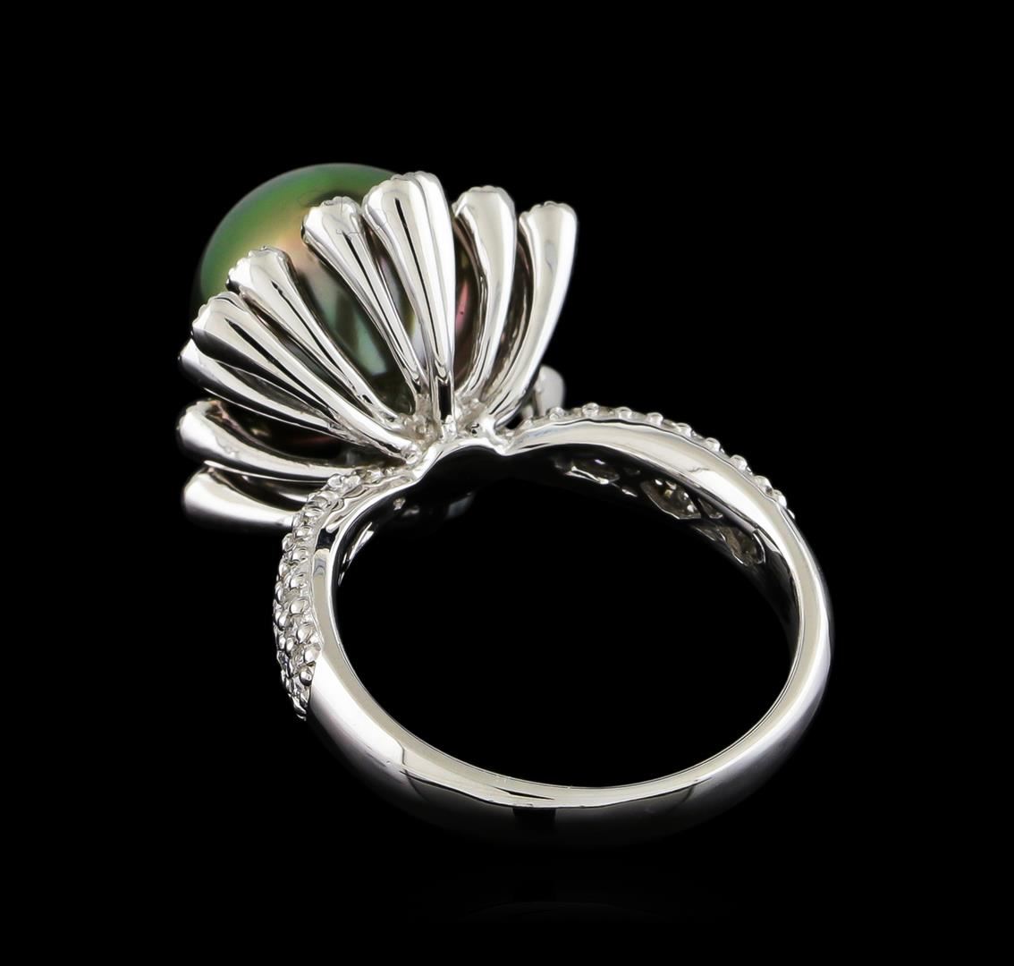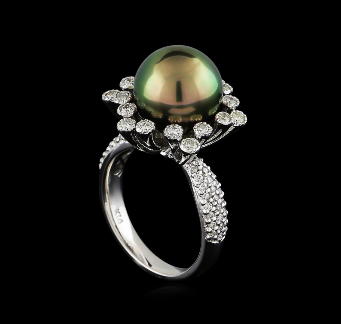 One electronically tested 14KT white gold ladies cast Tahitian cultured pearl and diamond ring with a bright polish finish. The featured Tahitian cultured pearl is set within a diamond floret bezel supported by diamond set shoulders, completed by three millimeter wide band. Identified with markings of "K14". Condition is new, good workmanship. Containing: One Tahitian cultured pearl, 11.5mm in size. The pearl is black in color with a very good luster, round, mostly clean Graded in the setting. Tahitian cultured pearls form in the large "Black Lipped" Pinctada Margaritifera oyster, which is about twice the size of the Japanese Akoya oyster. This warm water species from across the central and South Pacific Ocean is at home in the bays and lagoons of the islands &atolls of French Polynesia. Tahitian cultured pearl farmers generally raise their oysters in lagoons. Tahitian cultured pearls take from two to four years to form. Black pearls are known for their iridescent, vibrant, almost metallic natural colors, unique among saltwater cultured pearls. Though commonly called "Tahitian" pearls, they are actually gray, to a lighter or darker degree. Tahitian pearls have the unique ability to display a variety of colors at the same time, which can be seen glistening on their surface. Eighteen bezel set round brilliant cut diamonds, measuring 1.80 - 1.70 x 1.05mm (depth est.) approximate total weight of 18 Stones = 0.45ct. Graded in the setting. Clarity: I-1 to I-2. Color: G - H Fifty-Four bead set round brilliant cut diamonds, measuring 1.10 - 1.00 x 0.63mm (depth est.) approximate total weight of 54 Stones = 0.32ct. Graded in the setting. Clarity: I-1 to I-2. Color: G - I. Total Weight of Diamonds 0.77ct. Total Weight of Ring 9.86gm. AIG Appraised at $4,275.00.