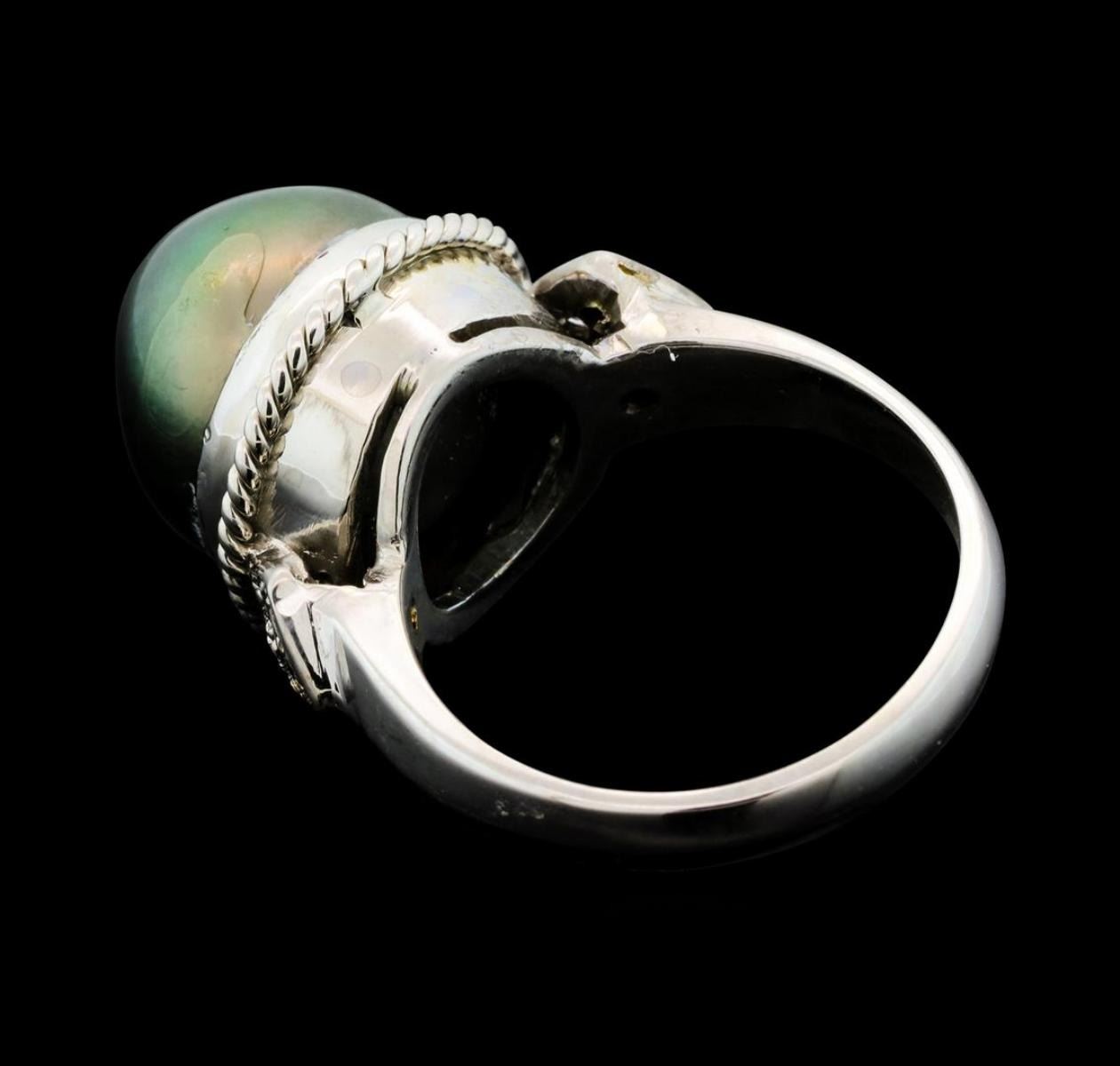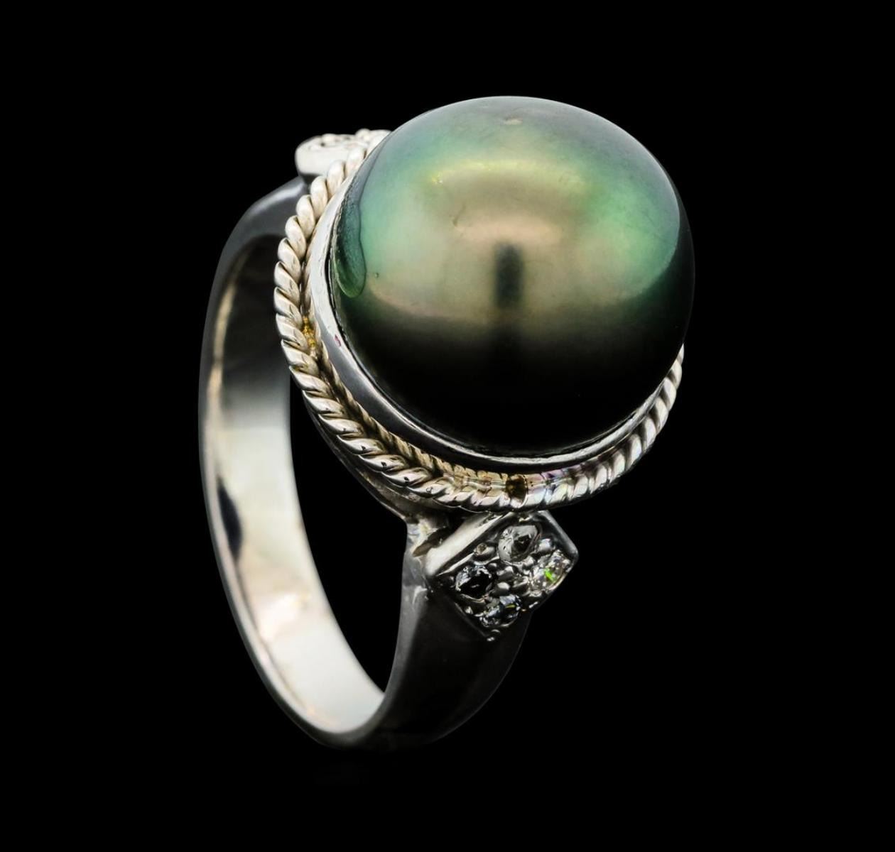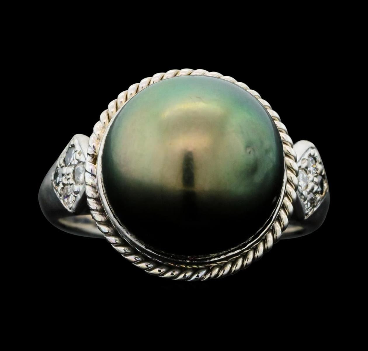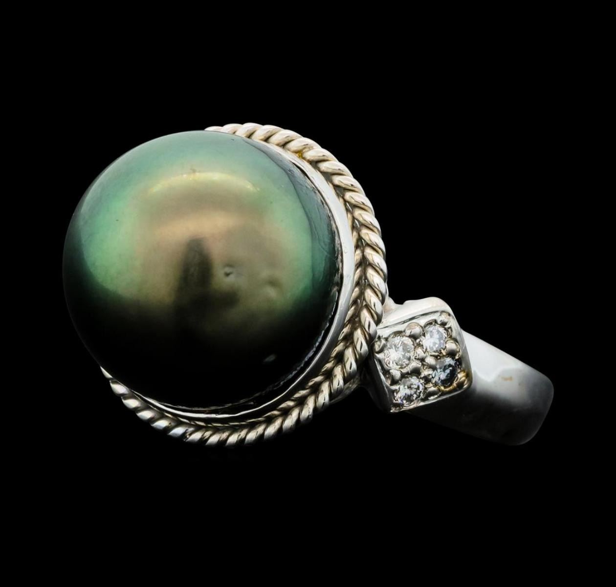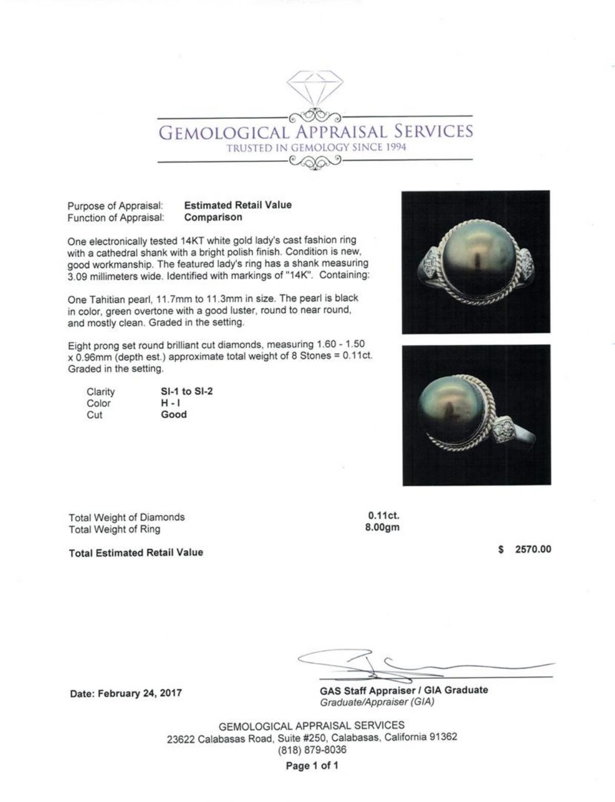 One electronically tested 14KT white gold lady's cast fashion ring with a cathederal shank with a bright polish finish. Condition is new good workmanship. The featured lady's ring has a shank mexuring 309 millimeters wide. Identi?ed with markings of "14K". Containing: One Tahitian pearl, 11.7mm to 11.3mm in size. The pearl is black in color, green overtone with a good luster, round to near round, and mostly clean. Graded in the setting. Eight prong set round brilliant cut diamonds, measuring 1.60 - 1.50 x 0.96mm (depth est.) approximate total weight of 8 Stones = 0.11ct Graded in the setting. Clarity SI-1 to SI-2 Color H - I Cut Good Total Weight of Diamonds 0.11ct. Total Weight of Ring 8.00gm Total Estimated Retail Value $2,570.00 GAS Appraised.