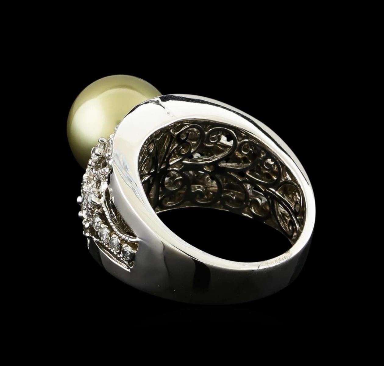 One electronically tested 14KT white gold lady's cast fashion ring with a bright polish with milgrain detailing finish. The featured lady's ring has a shank measuring 4.86 millimeters wide. Identified with markings of "14K". Condition is new, good workmanship. Containing: One Tahitian pearl, 11.3mm in size to 11.1mm in size. The pearl is silver in color, green overtone with a good luster, near round, and clean. Graded in the setting. Forty-Six prong set round brilliant cut diamonds, measuring 1.60 - 1.55 x 0.98mm (depth est.) approximate total weight of 46 Stones = 0.68ct. Graded in the setting. Clarity: VS-2 to SI-2. Color: G - Good Four prong set round brilliant cut diamonds, measuring 2.25 - 2.15 x 1.36mm (depth est.) approximate total weight of 4 Stones = 0.16ct. Graded in the setting. Clarity: VS-2 to SI-1. Color: H - I. Cut Very Good. Total Weight of Diamonds 0.84ct. Total Weight of Ring 10.60gm. GAS Appraised.