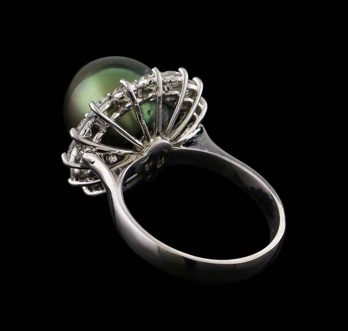 One electronically tested 14KT white gold lady's cast fashion ring with a basket halo with a bright polish finish. The featured lady's ring has a shank measuring 3.20 millimeters wide. Identified with markings of "K14". Condition is new, good workmanship. Containing: One Tahitian pearl, 11.8mm in size to 11.7mm in size. The pearl is black in color, green overtone with a good luster, round, and clean. Graded in the setting. Fourteen prong set round brilliant cut diamonds, measuring 3.05 - 2.95 x 1.86mm (depth est.) approximate total weight of 14 Stones = 1.43ct. Graded in the setting. Clarity: SI-1 to I-1. Color: H - I. Cut Good. Total Weight of Diamonds 1.43ct. Total Weight of Ring 7.70gm. GAS Appraised.