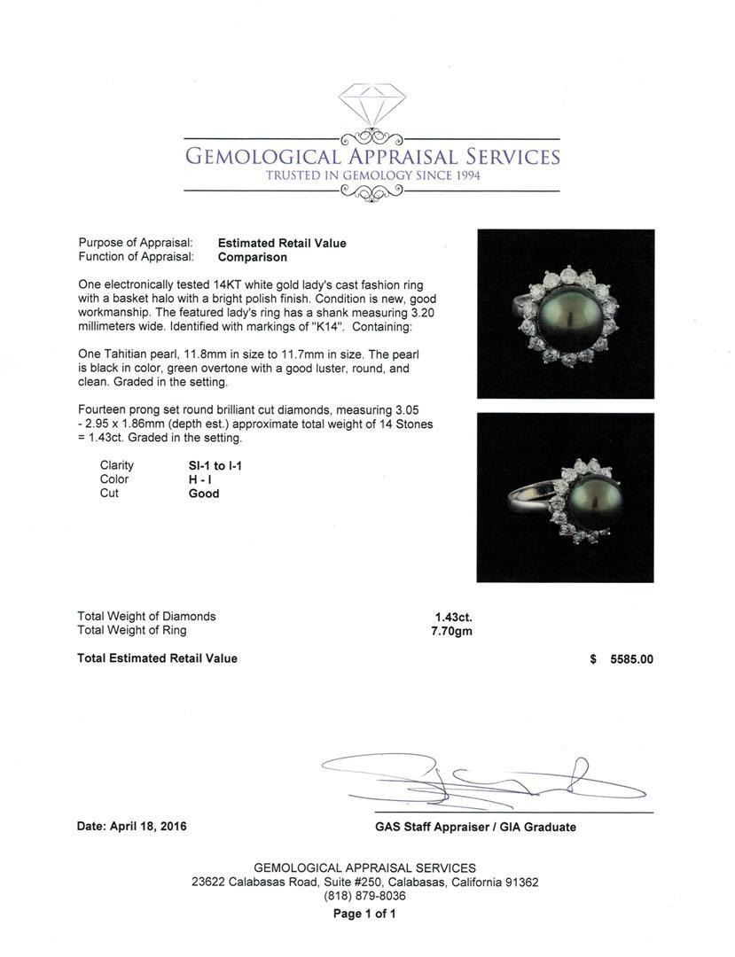 One electronically tested 14KT white gold lady's cast fashion ring with a basket halo with a bright polish finish. The featured lady's ring has a shank measuring 3.20 millimeters wide. Identified with markings of "K14". Condition is new, good workmanship. Containing: One Tahitian pearl, 11.8mm in size to 11.7mm in size. The pearl is black in color, green overtone with a good luster, round, and clean. Graded in the setting. Fourteen prong set round brilliant cut diamonds, measuring 3.05 - 2.95 x 1.86mm (depth est.) approximate total weight of 14 Stones = 1.43ct. Graded in the setting. Clarity: SI-1 to I-1. Color: H - I. Cut Good. Total Weight of Diamonds 1.43ct. Total Weight of Ring 7.70gm. GAS Appraised.