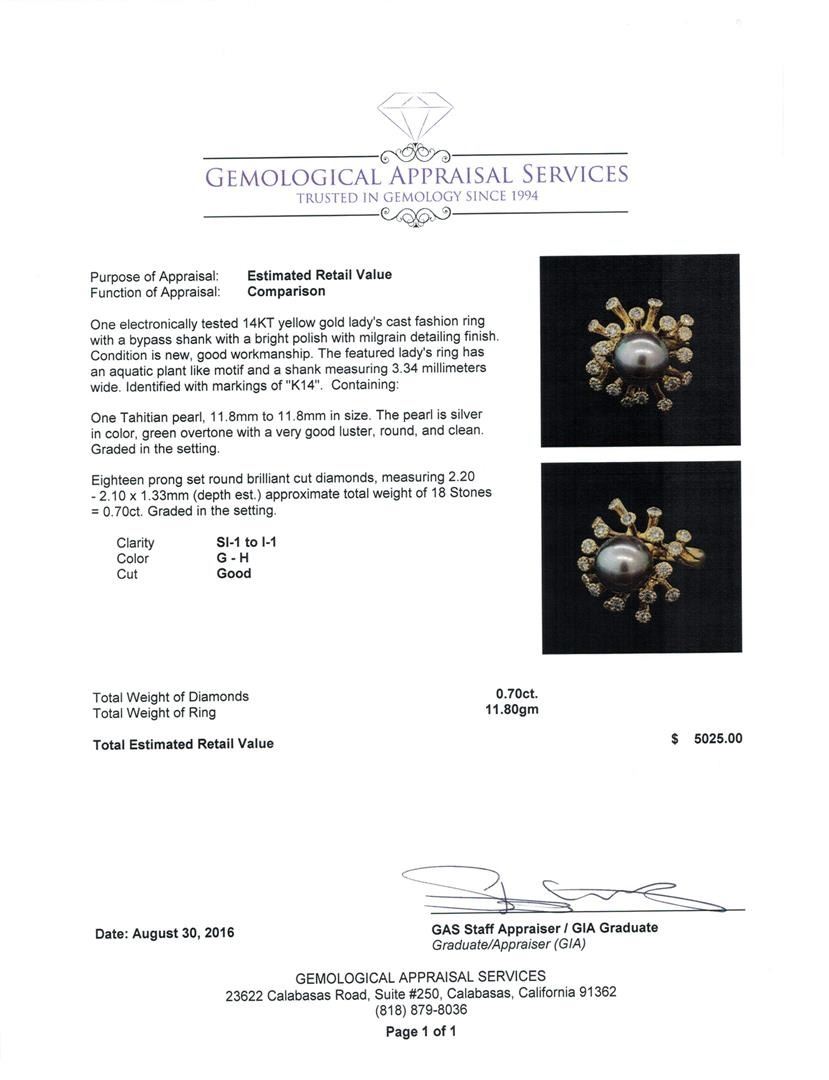 One electronically tested 14KT yellow gold lady's cast fashion ring with a bypass shank with a bright polish with milgrain detailing finish. The featured lady's ring has an aquatic plant like motif and a shank measuring 3.34 millimeters wide. Identified with markings of 'K14'. Condition is new, good workmanship. Containing: One Tahitian pearl, 11.8mm to 11.8mm in size. The pearl is silver in color, green overtone with a very good luster, round, and clean. Graded in the setting. Eighteen prong set round brilliant cut diamonds, measuring 2.20 - 2.10 x 1.33mm (depth est.) approximate total weight of 18 Stones = 0.70ct. Graded in the setting. Clarity SI-1 to I-1. Color: G - H Cut Good. Total Weight of Diamonds 0.70ct. Total Weight of Ring 11.80gm. GAS Appraised at $5,025.00.