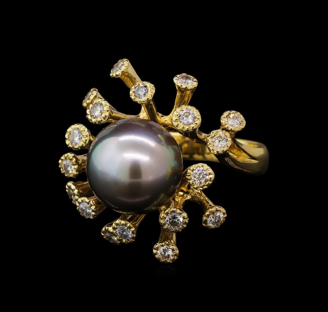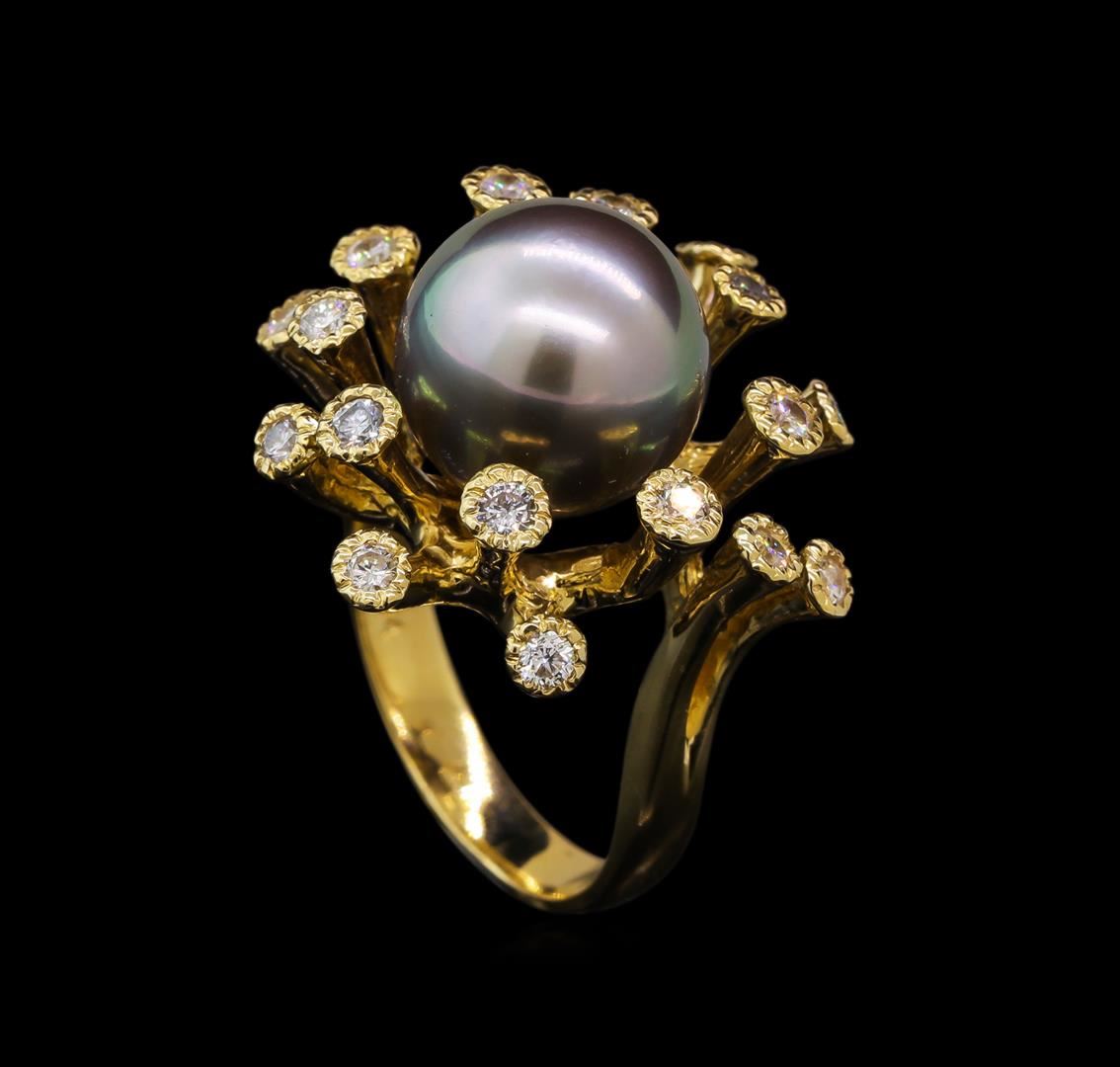 One electronically tested 14KT yellow gold lady's cast fashion ring with a bypass shank with a bright polish with milgrain detailing finish. The featured lady's ring has an aquatic plant like motif and a shank measuring 3.34 millimeters wide. Identified with markings of 'K14'. Condition is new, good workmanship. Containing: One Tahitian pearl, 11.8mm to 11.8mm in size. The pearl is silver in color, green overtone with a very good luster, round, and clean. Graded in the setting. Eighteen prong set round brilliant cut diamonds, measuring 2.20 - 2.10 x 1.33mm (depth est.) approximate total weight of 18 Stones = 0.70ct. Graded in the setting. Clarity SI-1 to I-1. Color: G - H Cut Good. Total Weight of Diamonds 0.70ct. Total Weight of Ring 11.80gm. GAS Appraised at $5,025.00.