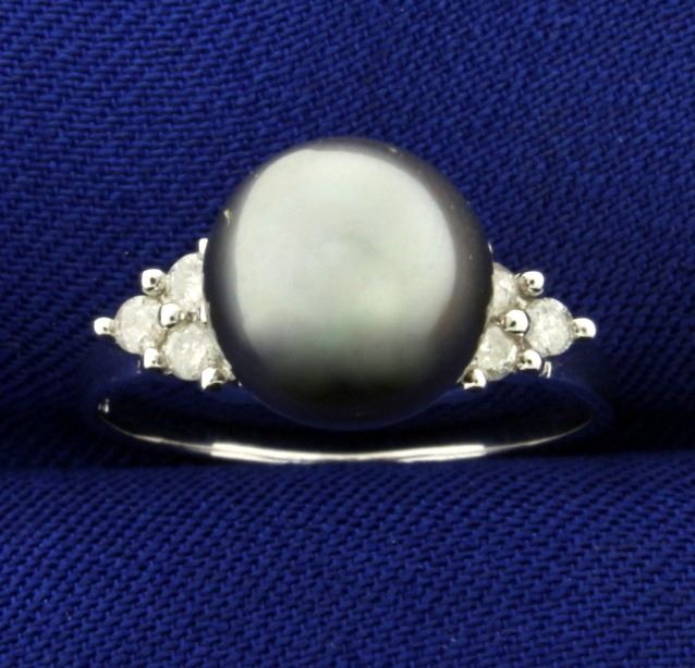 In 14k white gold. Contains a 9mm Tahitian pearl with fantastic black silver color and high luster. Also contains six high quality .03ct diamonds, G color/I1 clarity. Size 6. 3.1g.