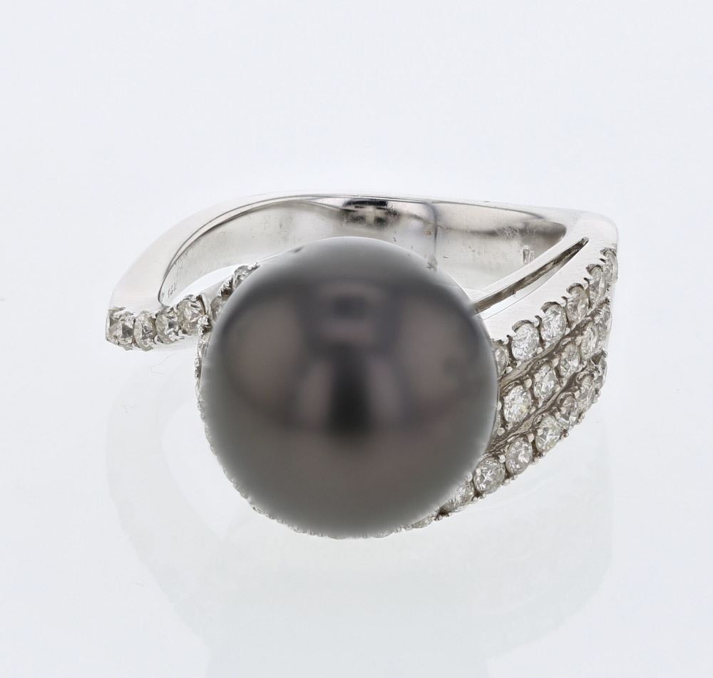 Tahitian Pearl w/ 3-row Shank Diamond Ring in 14K White Gold
