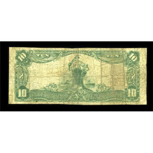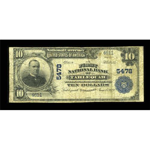 <B>Tahlequah, OK</B></I> - $10 1902 Plain Back Fr. 633 <B>The First NB</B></I> Ch. # 5478<BR> A tougher bank in large size, with this one of just eight such examples reported. We sold this piece back in May of 2003, when it realized $402.50. Expect it to bring somewhat more this evening. <B>Very Good.</B></I><BR><BR><b>Shipping:</b> Coins & Currency (<a target="_blank" href="http://www.heritageauctions.com/common/shipping.php">view shipping information</a>)