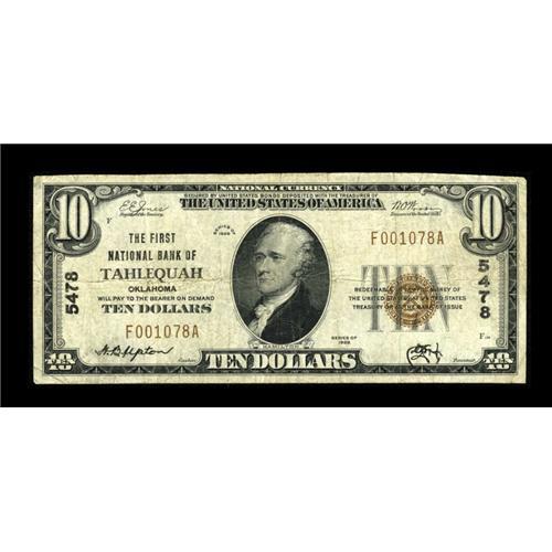 <B>Tahlequah, OK</B></I> - $10 1929 Ty. 1 <B>The First NB</B></I> Ch. # 5478<BR>This was the first of five banks chartered in this Cherokee County location, and the only one which survived long enough to issue Series 1929 examples. <B>Fine.</B></I><BR><I>From The Rolling Plains Collection</B></I><BR><BR><b>Shipping:</b> Coins & Currency (<a target="_blank" href="http://www.heritageauctions.com/common/shipping.php">view shipping information</a>)