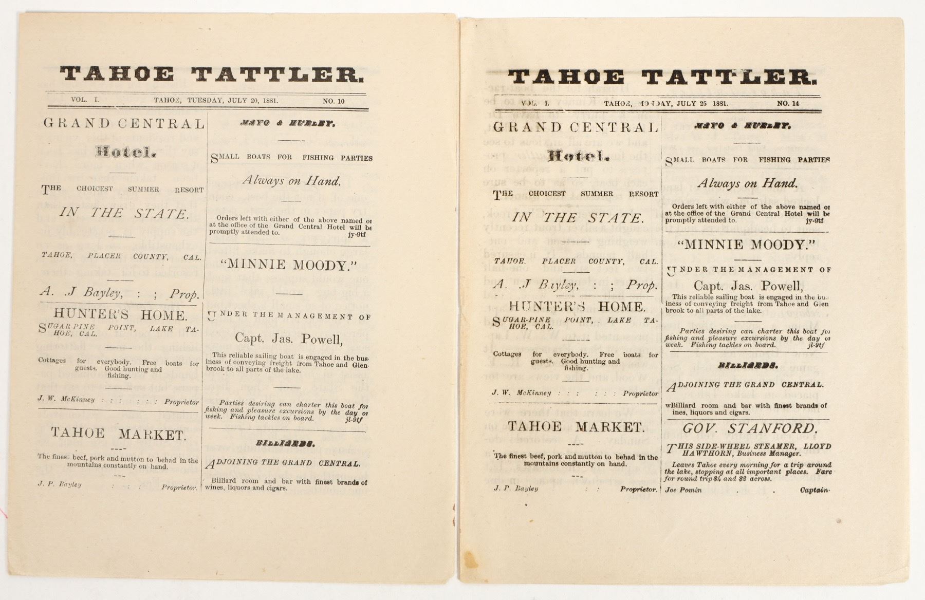 Lot of 2 different. These papers have become nearly impossible to find. Short-lived mini-newspaper printed out of the Grand Central Hotel in Tahoe City. 6.75 x 5.25" 1) Vol. 1, No. 14, July 25, 1881. This issue is very trout and fishing focused. Also has a blurb about Rubicon soda water out of McKinney's! Front and back have ads for hotels, saloons, and steamers. 2) Vol. 1. No. 10. July 20, 1881. Mentions fishing, hunting, steamer excursions, and a bowling game at the Grand Central. Front and back have ads for hotels, saloons, and steamers.