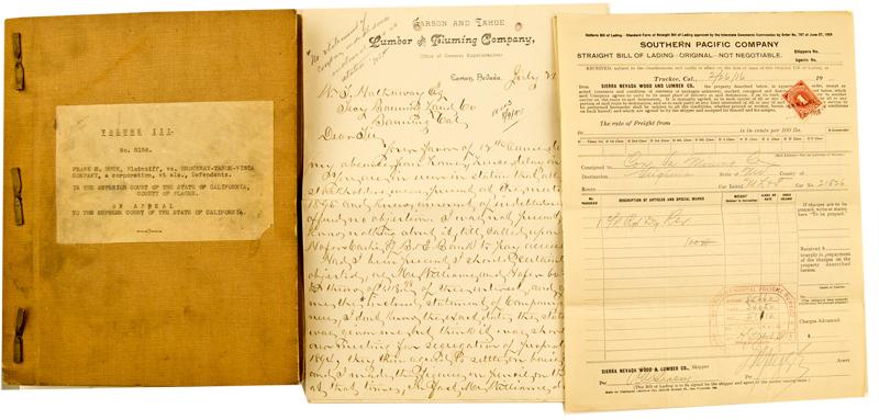 Lot of five pieces: 1) A 1929 legal transcript of the case of Frank H. Buck, Plaintiff, vs. Brockway-Tahoe-Vista Company in the Superior Court of California, Placer County, with Hon. J.B. Landis, Judge presiding. The case involves the meeting of the Placer County Board of Supervisors on Dec. 8, 1914 regarding the Cala-Neva (sic) Plat, a subdivision of land on the shore of Lake Tahoe and the Nevada state line. The transcript is a carbon copy, bound in 8 x 10” hard covers and held together with brads, and consists of 223 pages, notarized and signed; 2) a 2-page 1897 letter on the letterhead of the Carson and Tahoe Lumber and Fluming Company, datelined Carson, Nevada, and addressed to W.T. Hathaway; 3) a small brochure on the Bonnie Beach Resort at Tahoe’s north shore, located between Kings Beach and Brockway; 4) South Lake Tahoe Chamber of Commerce brochure from 1969; 5) Southern Pacific Company bill of lading, dated 1916, from Sierra Nevada Wood & Lumber Co., shipper.