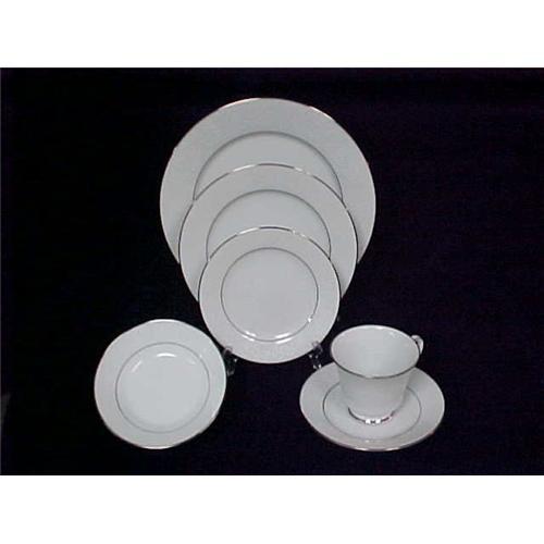 Tahoe by Noritake - 12 Place Setting (6 pieces each) Beautiful white on white border design- elegant and classic- place settings include: dinner plate, luncheon plate, bread and butter plate, cup and saucer, and fruit/desert bowl. All pieces are in extremely good condition and come in lovely vinyl cases that zipper shut. We also have serving pieces available.