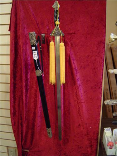 39" Tai Chi Sword. Black handle, Dragon Motif Antique Brass Fittings, 30" Stainless Blade with Dragon and Dragon Star Constellation Etchings, flat edge. Black Laquer Scabbord. Suitable for Practice Use.