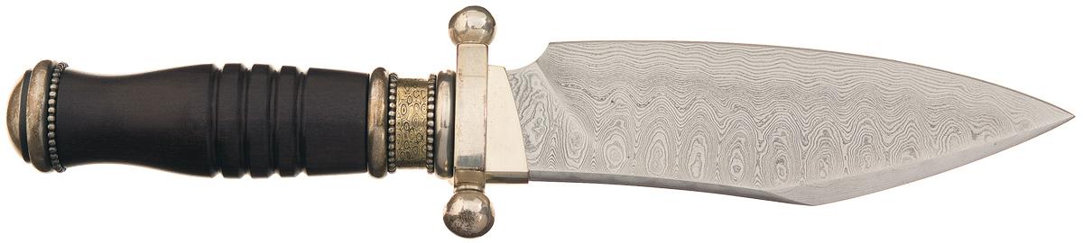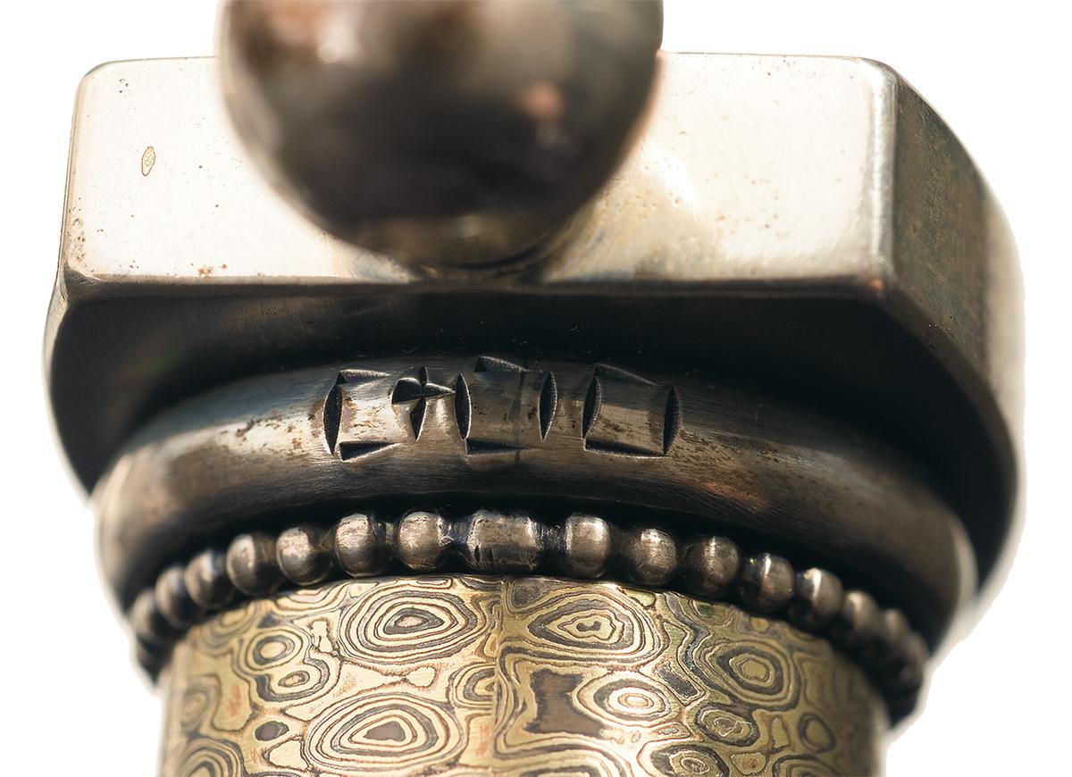 This knife was handcrafted by Master Knifemaker Tai Goo. In a career that started in 1978, Tai Goo has established himself as a world renowned neo-tribal knife maker and is the founder of the Neo-Tribal Metalsmiths. In fact, many consider him to be the "eccentric genius" who created the Neo-Tribal metalsmithing movement. This Goo knife has a 5 1/2 inch Damascus blade with silver collar. Silver guard. Grooved hardwood handle with silver fittings accented with three bands of beads and a Damascus panel. Standard chiseled "GOO" signature. OAL: 10 1/4".