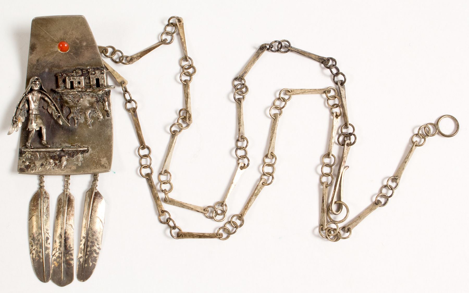"Tail Feathers" handcrafted by R. K. (Robert Koeppler), 'The Ringworm'. Sterling silver necklace on silver chain. Image of an Indian Pueblo and an Eagle Dancer on a cliff. Inset with a coral bead (sun) with three feathers hanging at bottom of pendant. Comes in a beautiful wood box.