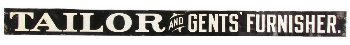 Tailor and Gents' Furnisher Tin Shelf Sign. Creases and paint loss otherwise good condition.