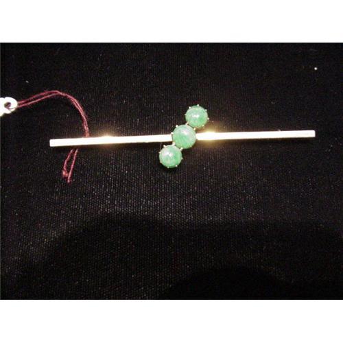 Wonderful tailored 18kt yellow gold and jade barpin circa 1910 set with three round cabachons of jade prong center on the diagonal. Crisp clean look. Reverse - ball hinge, safety lever clasp. quality gold mark for 18kt. Nice piece!