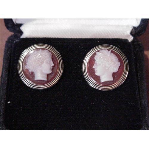 Great dramatic and tailored brown and white Classic head in profile hardstone cameos with black enamel tracery set in yellow gold stud back earrings, Circa 1900 (most likely originally cufflinks) in good condition (few dents to bezel on one earring - not noticeable)!! Look great on the ear. Very tailored and wearable with today's fashions. Exquisite design.