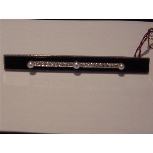 Attractive lady's tailored designed Art Deco Circa 1920 platinum diamond pearl and black onyx bar pin set with 18 small single cut diamonds, 3 pearls into a black onyx rectagular shaped plaque open pierced work sides - ball hinge, safety catch, stabilizer bar reverse all original. Fabulous condition. Great deco design. Smart tailored look. This piece goes great with R301 (ring 301). Great Deco Detailing!!
