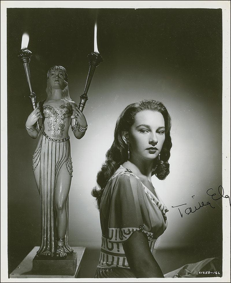 Vintage glossy 8 x 10 photo of Elg posing in front of a torch-bearing statue, signed in fountain pen. Creases to both lower corners and some scattered light surface marks, otherwise fine condition.
