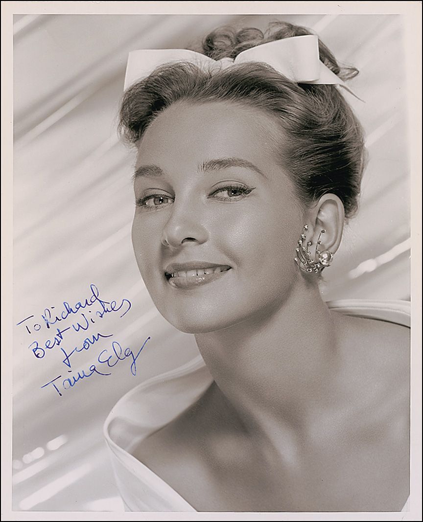 Vintage heavyweight glossy 8 x 10 photo of Elg with a ribbon in her hair, signed and inscribed in fountain pen “To Richard, Best Wishes from Taina Elg.” A crease atop her hair, a few light bends, and two paperclip impressions at the top, otherwise fine condition.
