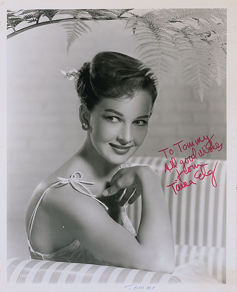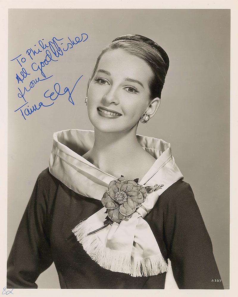 Two photos: glossy 8 x 10 photo, signed and inscribed in red felt tip, “To Tommy, all good wishes from Taina Elg”; and a glossy 8 x 10 doubleweight MGM publicity photo, signed and inscribed in blue felt tip, “To Philipp, all good wishes from Taina Elg.” In overall fine condition, with small ballpoint notations to bottom borders.