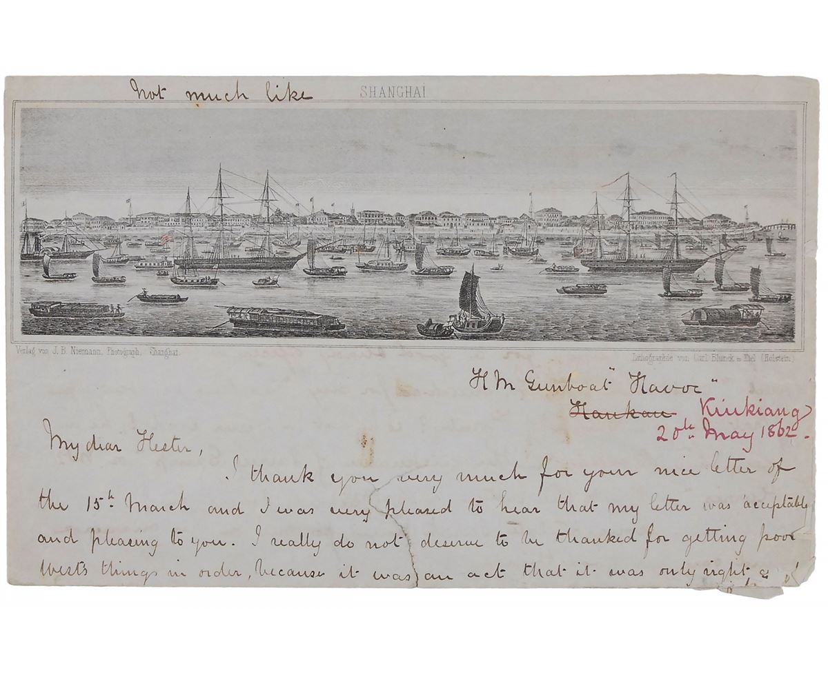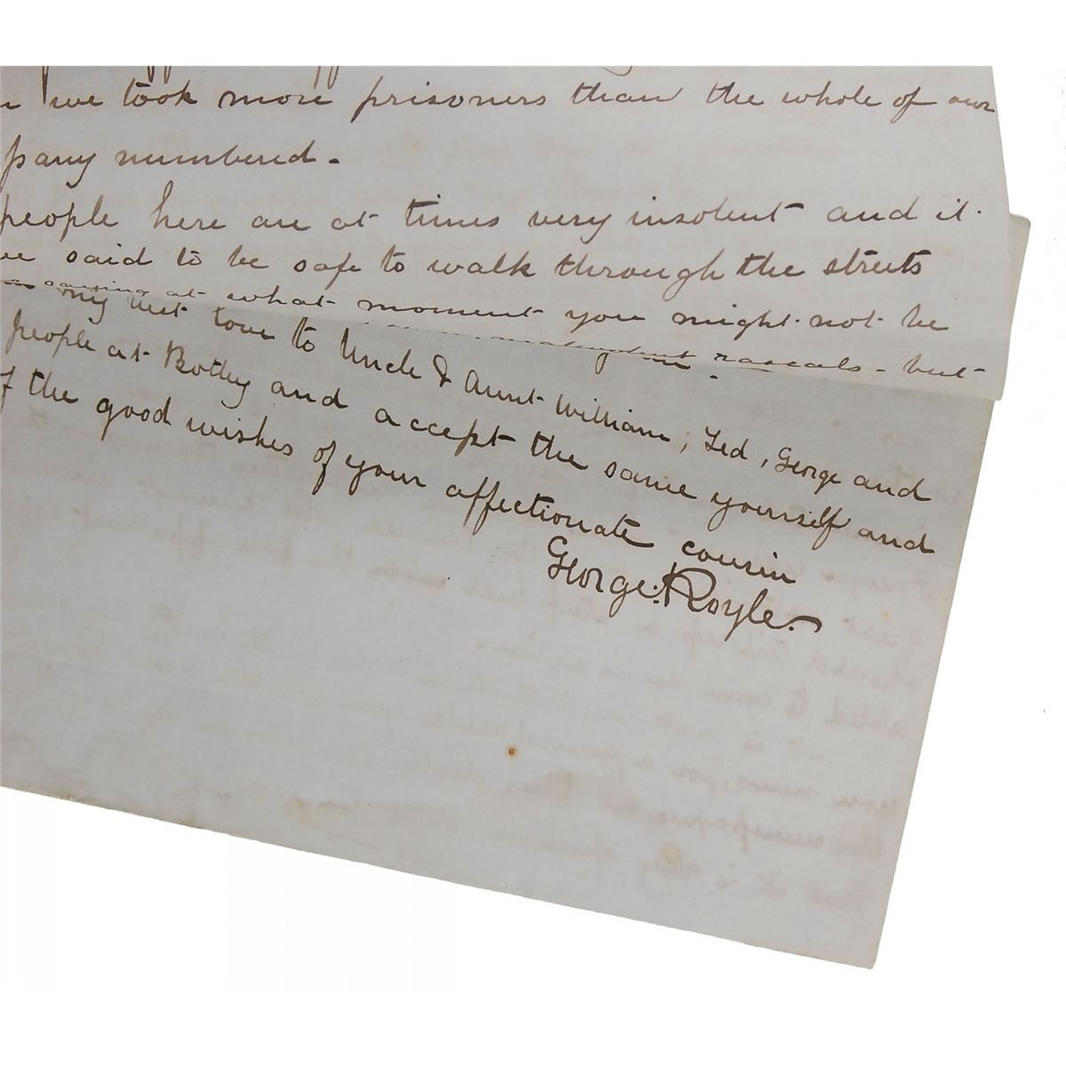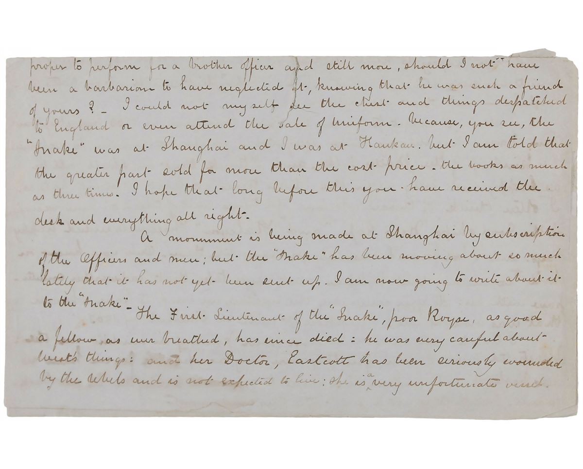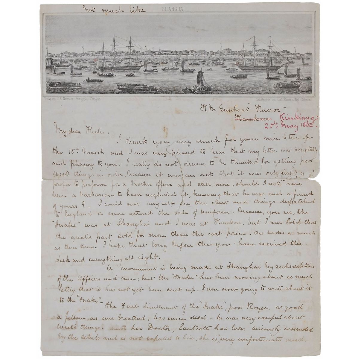 ALS signed “George Royle,” four pages on two adjoining sheets, 9.25 x 11.75, engraved ‘Shanghai’ letterhead, May 20, 1862. Lengthy letter to his cousin Hester, written from the H. M. Gunboat Havoc in Kinkiang. In part: “It is not my intention to compete with the newspapers in telling you news, for a general rule you get the most correct information in the newspapers, at this distance inland we only hear faint rumours. But it is my opinion that the Tai-pings or rebels are getting a very severe beating. I wish I could come in for a share of the fighting. This vessel has captured 7 or 8 Imperial War junks since we have been in the river for different offices, but they never resist us. On one occasion we took more prisoners than the whole of our ship’s company numbered...The people here are at times very insolent and it can never be said to be safe to walk through the streets for there is no saying at what moment you might not be killed on the spot by some of these malevolent rascals, but I take my chance with the rest and trust to providence and a big stick and occasionally to a revolver." In very good condition, with a noticeable tear to the center, partial separations along extremely fragile middle fold (item was not unfolded to image it due to fragility), and slight show-through from writing to opposing sides.