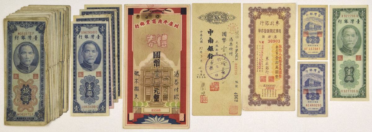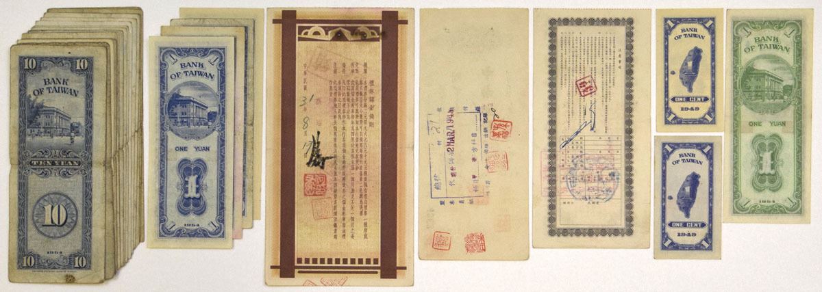 Taiwan, 1949--58. Lot of 25 Issued Banknotes and Checks, Includes: 1949, 1 Cent, P-1946 (2) S/M#T73-1, CPF; 1954, 1 Yuan, P-1964 (4) S/M#T73-31, PFBT; 1 Yuan, P-1965 S/M#T73-30, PFBT; 10 Yuan, P-1967 (15) S/M#T73-32, PFBT. Lot also includes with checks printed in Chinese. Notes range from Fine to AU condition. (25). Sold "AS IS" no returns accepted.