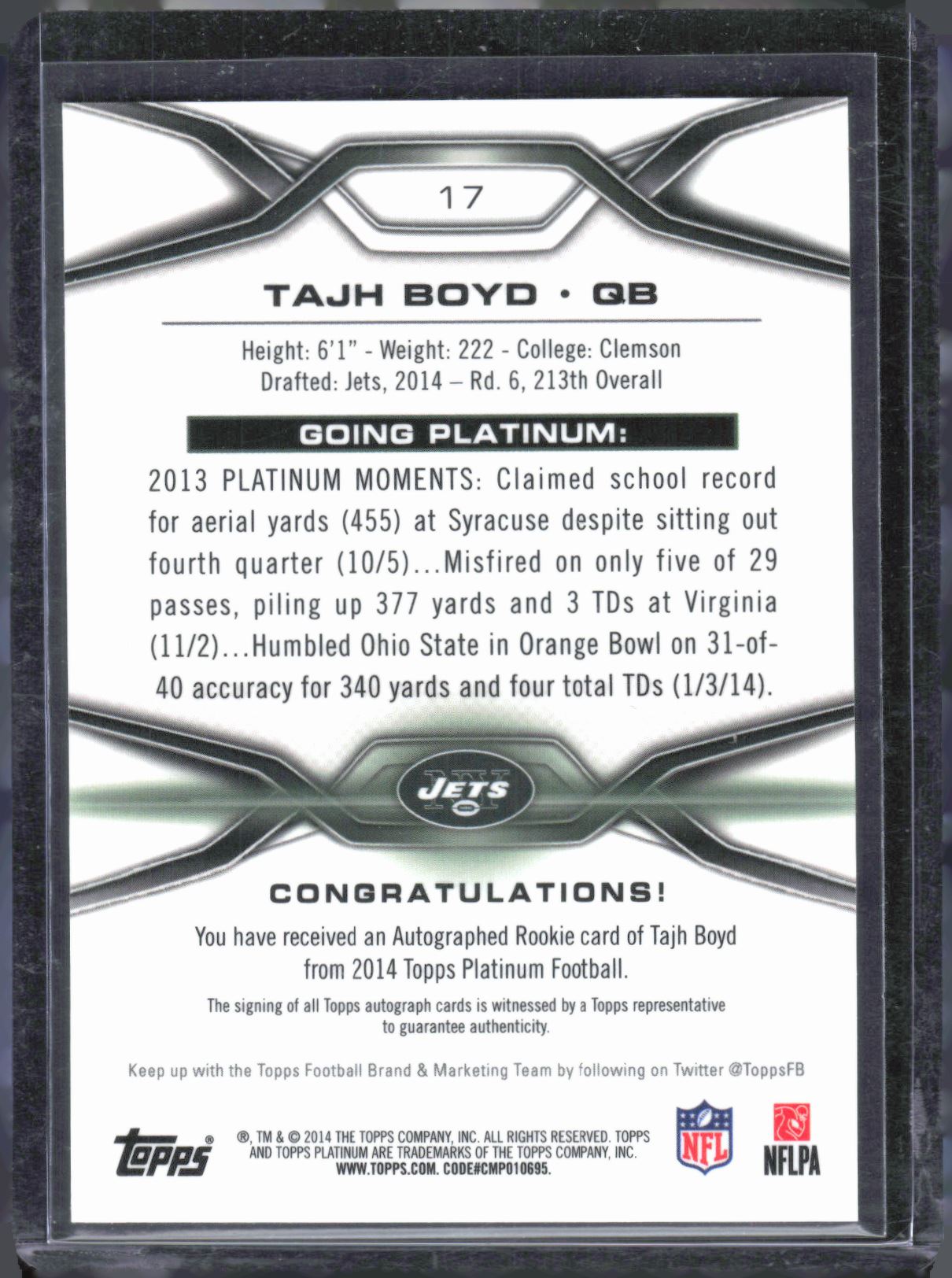 Tajh Boyd Rookie Auto /150 2014 Topps Platinum #17