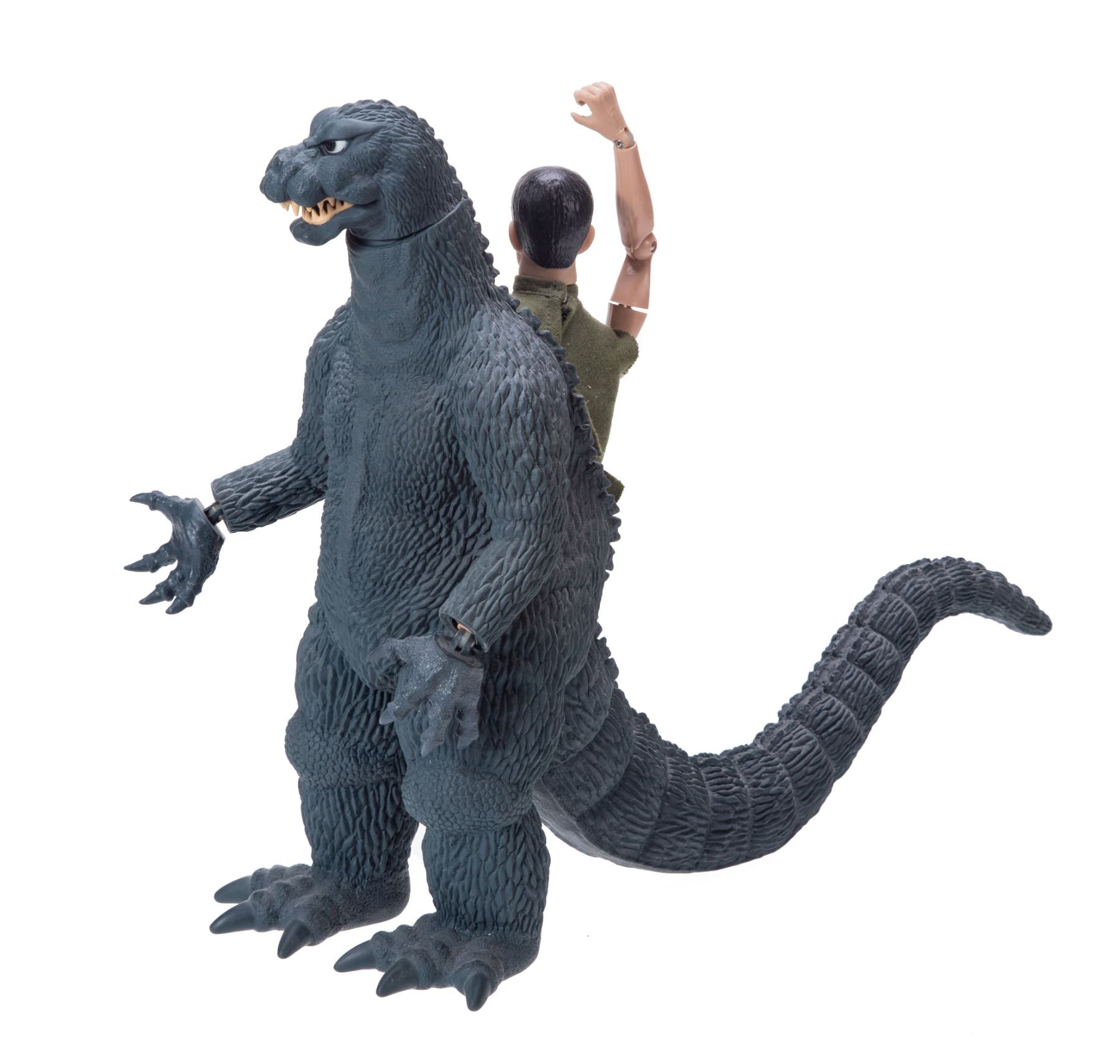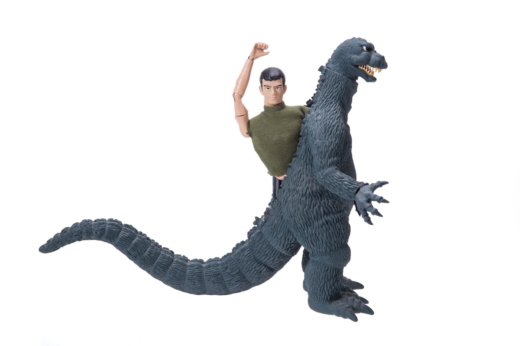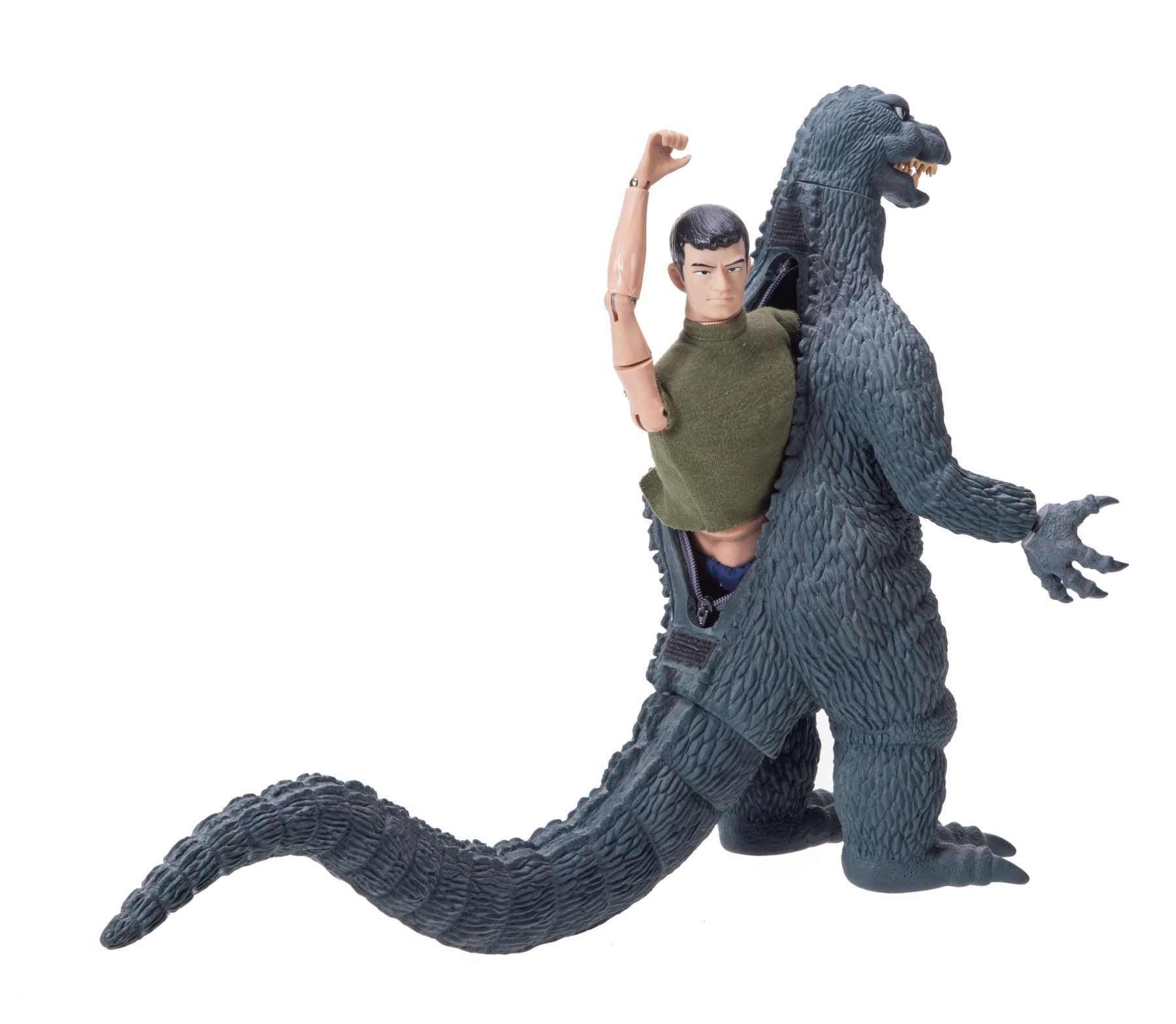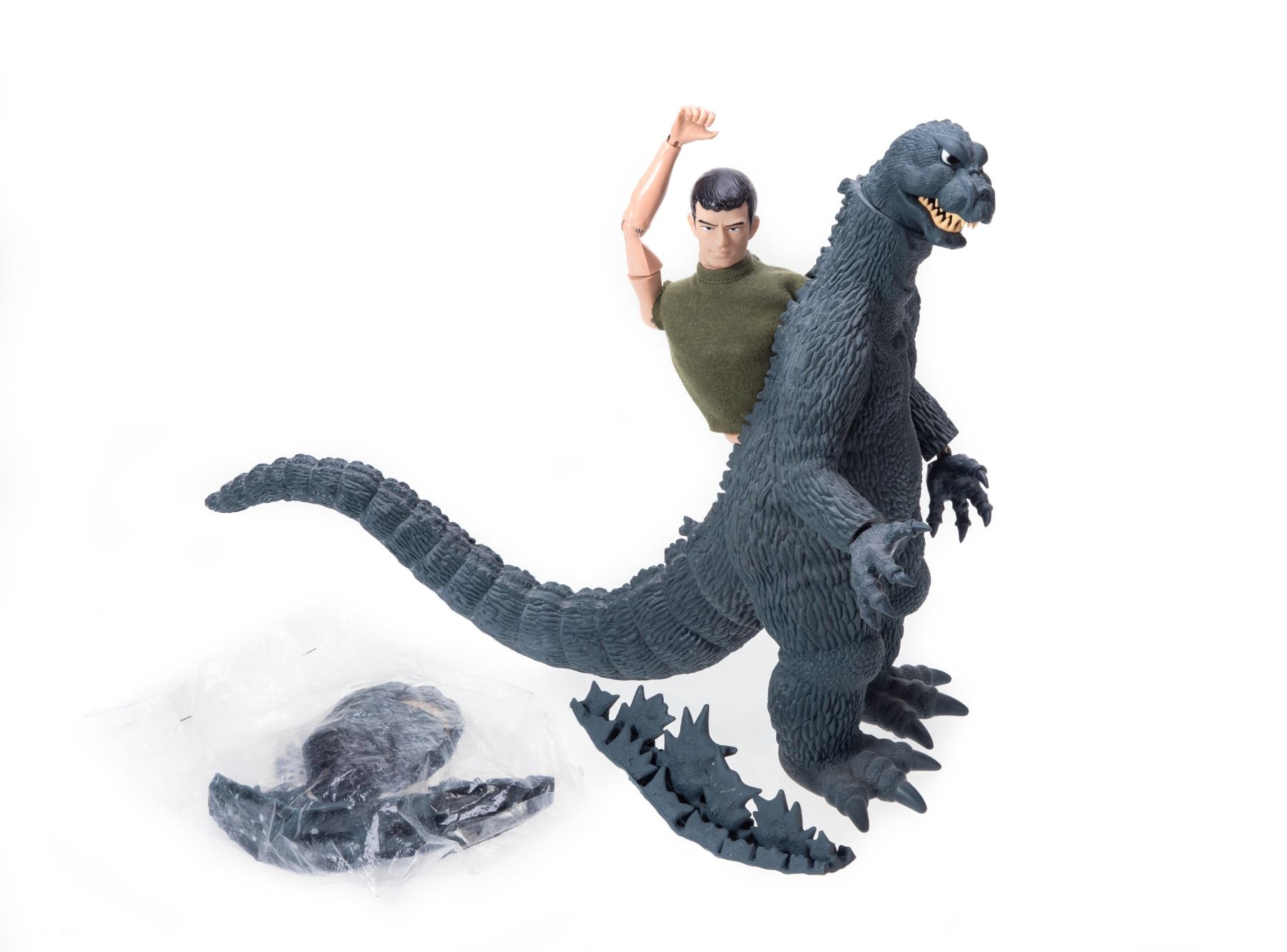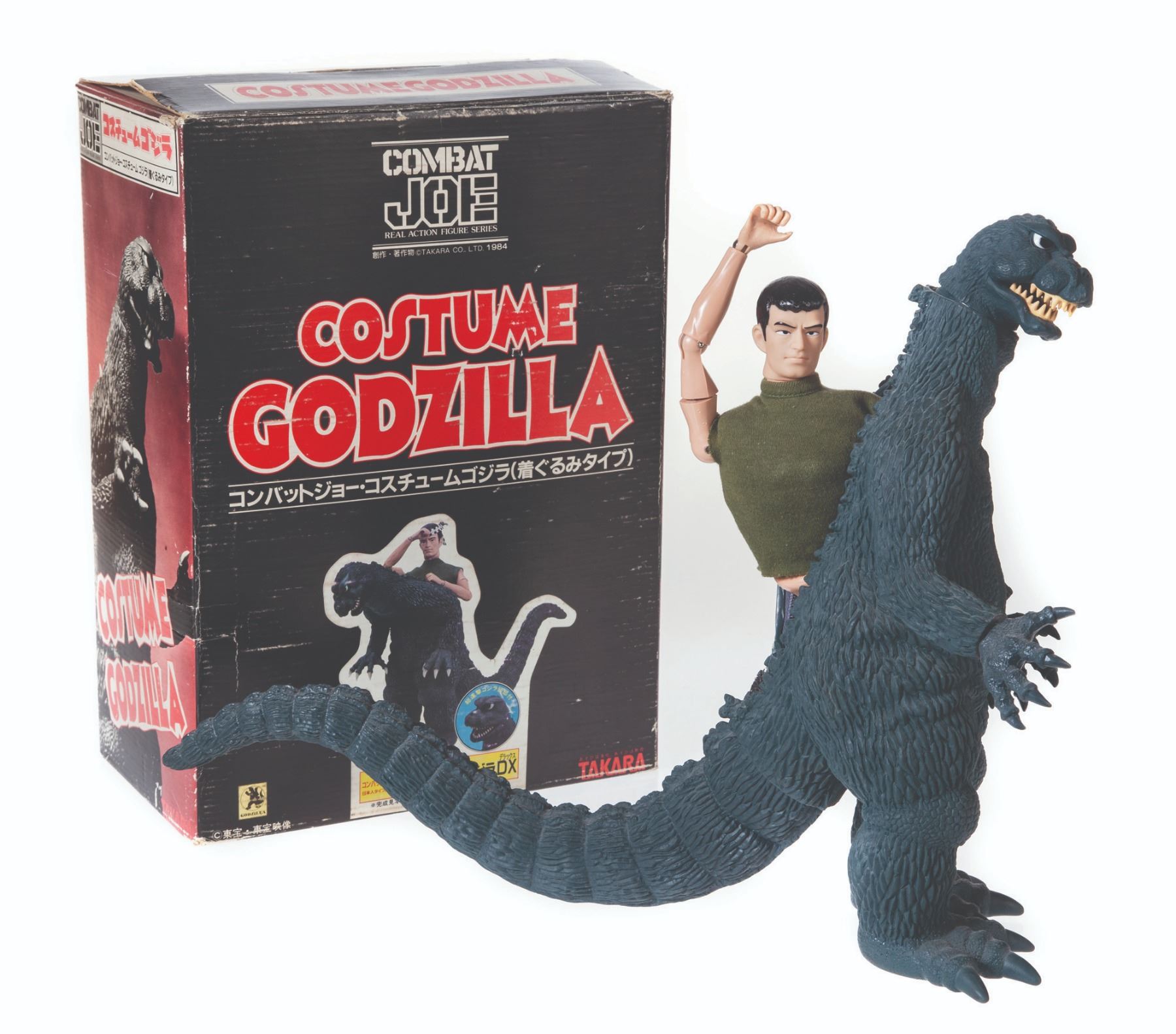 1984. Takara Godzilla 1964 Combat Joe Costume Godzilla Figure & Suit Boxed. 13” tall figure. Accessories complete. VG+ Box has minor wear.
