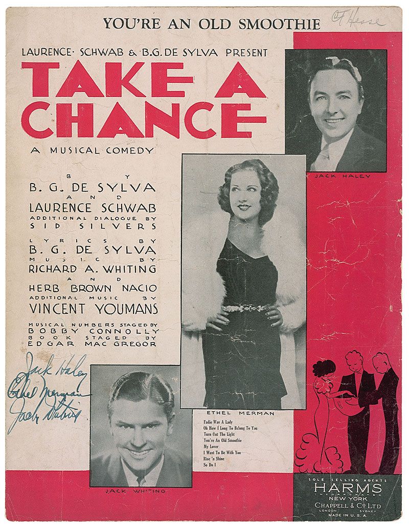 Vintage sheet music for ‘You’re an Old Smoothie’ from Take a Chance, 9 x 12, five pages, signed on the front cover in fountain pen by Jack Haley, Ethel Merman, and Jack Whiting. In very good condition, with overall creases and some subtle staining touching the top of Haley’s signature.