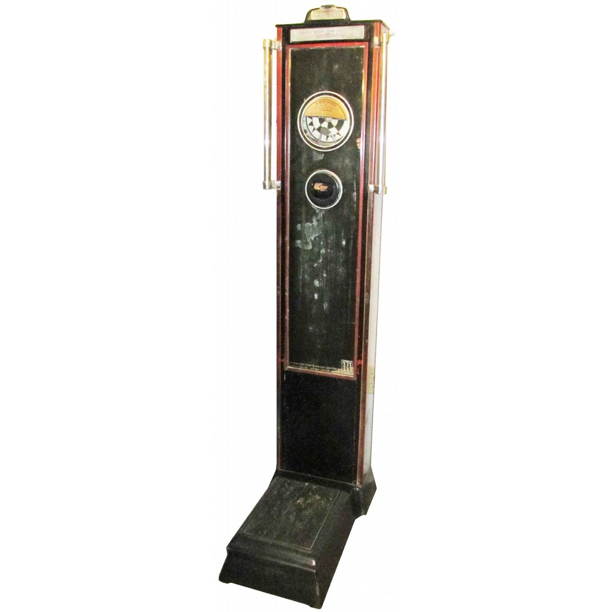Take A Ticket Penny Scale. International Ticket Scale Corp. This one was licensed for NB. These were found in Woolworth Stores. Printed weight and fortune. Needs ink otherwise very good condition, comes with key. 66 inches tall.