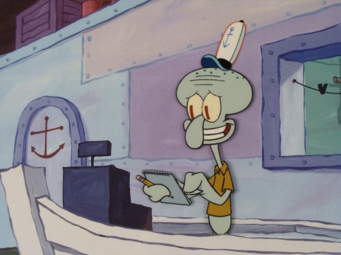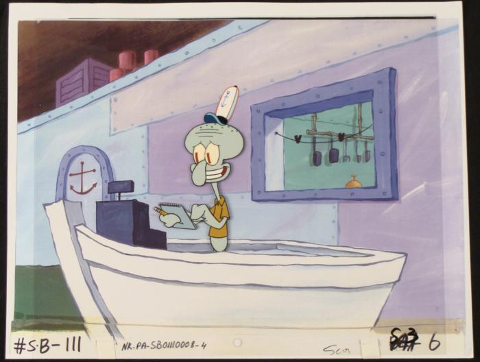 This animation cel and reproduction background are from the Nickelodeon TV show SpongeBob Squarepants. The story takes place under the deep blue sea in Bikini Bottom, where SpongeBob resides. SpongeBob, who is a yellow, porous sponge, is your typical happy-go-lucky character, as he is always cheerful and enjoys making people laugh. Patrick Star, SpongeBob's neighbor who is a starfish, is your average children's show idiot, as he boasts knowing nothing and is often getting himself into ridiculous situations. Between the homes of these two lies the home of the miserable Squidward, a squid, who is known for being grouchy and playing tricks on SpongeBob and Patrick. Both SpongeBob and Squidward work at the Krusty Krab, a fast food business run by the greedy money-loving Mr. Krabs, a crab, the arch rival of the evil, possibly misunderstood, Plankton. Another neighbor, Sandy Cheeks, an athletic squirrel who normally wears an astronaut's space suit, was introduced in "Tea at the Treedome." She spends most of her time inventing and experimenting. Squidward is taking orders at the Krusty Krab.Original Printed Background and Animated Cel Overall Size of Background: 10 1/2" x 14" Overall Size of the Cel: 10 1/2" x 12 1/2" Very good condition This is an original hand-painted cel set-up used in the production of an episode of "SpongeBob SquarePants." Each one-of-a-kind set-up represents a slight change in position of the characters. When individually photographed and projected in rapid succession, the images appear to move.