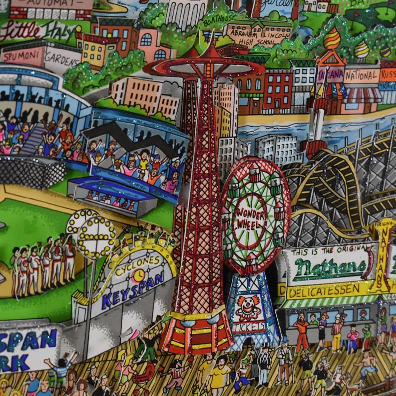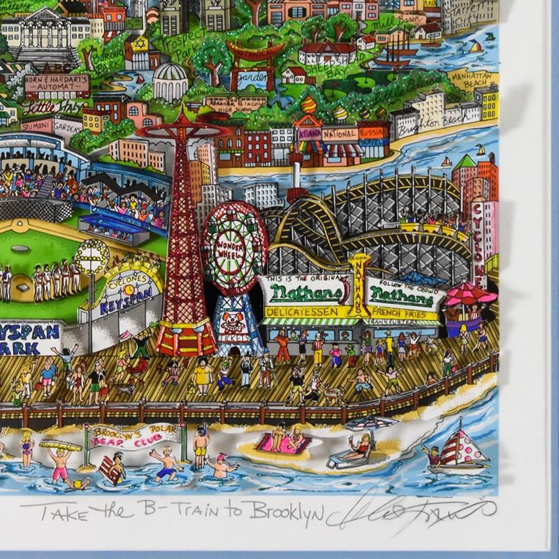"Take the B Train (Sky Blue)" is a 3D limited edition silk screen construct on paper by Charles Fazzino, numbered 87/150 and hand signed by the artist. This piece comes custom framed. Includes Certificate of Authenticity. Measures approximately 21.5" x 27
