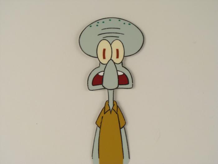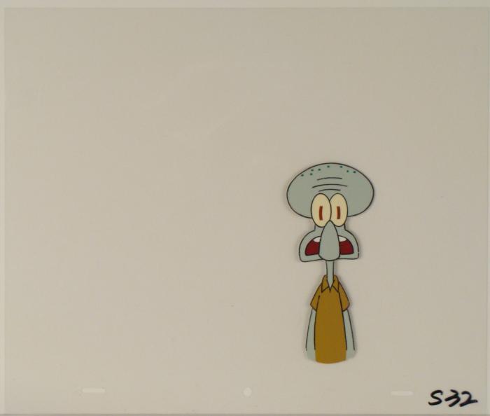 This original animation cel is from the Nickelodeon TV show SpongeBob Squarepants. The story takes place under the deep blue sea in Bikini Bottom, where SpongeBob resides. SpongeBob, who is a yellow, porous sponge, is your typical happy-go-lucky character, as he is always cheerful and enjoys making people laugh. Patrick Star, SpongeBob's neighbor who is a starfish, is your average children's show idiot, as he boasts knowing nothing and is often getting himself into ridiculous situations. Between the homes of these two lies the home of the miserable Squidward, a squid, who is known for being grouchy and playing tricks on SpongeBob and Patrick. Both SpongeBob and Squidward work at the Krusty Krab, a fast food business run by the greedy money-loving Mr. Krabs, a crab, the arch rival of the evil, possibly misunderstood, Plankton. Another neighbor, Sandy Cheeks, an athletic squirrel who normally wears an astronaut's space suit, was introduced in "Tea at the Treedome." She spends most of her time inventing and experimenting. Shown here is a taken aback Squidward.Original Production Animated Cel Overall Size of Cel: 10 1/2" x 12 1/2" Excellent ConditionThis is an original hand-painted cel set-up used in the production of an episode of "SpongeBob SquarePants." Each one-of-a-kind set-up represents a slight change in position of the characters. When individually photographed and projected in rapid succession, the images appear to move.