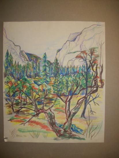 Talented Fauvist Landscape. Colored Pencil on Paper. Signed: "Benn 52" (lower right). Note: small piece of paper missing in lower corner. Does not enter art. Art needs matting and frame. Art is being sold "as-is", with all sales final. Art was acquired without history or documentation.