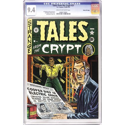 <B>Tales From the Crypt #21 Gaines File pedigree 10/10 (EC, 1951) CGC NM 9.4 Cream to off-white pages.</B></I> All the ingredients that made EC great came together here. Al Feldstein drew the story of a living corpse (as well as the cover in the same vein), Wally Wood took the reader to a haunted amusement park, and Graham Ingels drew a vampire tale. Oops, almost forgot a "haunted house" story drawn by Harvey Kurtzman! Overstreet 2006 NM- 9.2 value = $1,425. CGC census 6/06: 2 in 9.4, 4 higher. <BR><BR><B>Important notice:</B> Heritage usually auctions material at the rate of 200-250 lots per hour. On some occasions eBay Live bid software or the Internet may not be able to keep up with the pace of the auction. We recommend placing a realistic absentee bid now as insurance to avoid disappointment. Occasionally the auctioneer may eliminate or reject an eBay Live bid, and the auctioneer may also reopen a lot after the close of the eBay live bidding (usually because we missed an audience bid), and may reject your bid even if it shows you as the winning bidder. By bidding via eBay Live, you agree that Heritage may award the lot to another bidder at its sole discretion under the circumstances described above or any other reasonable circumstances. Since eBay bids are not shown to us until we open the lot on the floor, we treat those bids just like floor bids. In most cases the floor responds before the eBay bid is presented to us, due to Internet lag time, so for consistency we have made it a policy that floor bids are always considered first over tie eBay live bids. Also please note that all Heritage lots purchased through eBay Live carry a 22.5% Buyer's Premium. Please make sure you read the Terms and Conditions before you bid. This lot is being auctioned in conjunction with a live floor auction by Heritage Auction Galleries. All final auction and invoice information will be supplied by Heritage Auction Galleries, and all other information should be considered preliminary. Lot:41001 <BR><BR><B>Winning Notification and Billing:</B> After the FINAL session in this auction is complete, Heritage will send e-mail and snail mail invoices. This process normally takes several days. All final auction and invoice information will be supplied by Heritage Auction Galleries, and all other information should be considered preliminary. <BR><BR>This auction will be conducted on a live auction floor and over the Internet through eBay Live. If you choose to place an absentee bid, please take a moment to <font color='#0000ff'><u><a href='http://pages.ebay.com/liveauctions/help/before/laabsentee.html'>learn how eBay Live absentee bidding works</a></u></font><font color='#000000'>