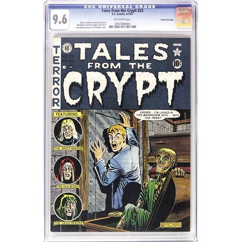 <B>Tales From the Crypt #23 Gaines File pedigree 6/10 (EC, 1951) CGC NM+ 9.6 Off-white pages.</B></I> Attention, Al Feldstein fans: This issue was the last of the series to have Feldstein interior art, reportedly because he was too busy with all of his editing and writing chores for EC. He did continue to contribute covers, though, and this cover's by him as well. Meanwhile, this issue has Jack Davis' first art for this title; it's the story of a businessman who believes that seances are a bunch of nonsensical hocus-pocus until... you'll have to read the story. Also, Johnny Craig contributed art on a tale of two pals who witness a voodoo ritual and live to regret it. The issue also has art by "Ghastly" Graham Ingels. Overstreet 2006 NM- 9.2 value = $865. CGC census 5/06: 6 in 9.6, 1 higher. <BR><BR><B>Important notice:</B> Heritage usually auctions material at the rate of 200-250 lots per hour. On some occasions eBay Live bid software or the Internet may not be able to keep up with the pace of the auction. We recommend placing a realistic absentee bid now as insurance to avoid disappointment. Occasionally the auctioneer may eliminate or reject an eBay Live bid, and the auctioneer may also reopen a lot after the close of the eBay live bidding (usually because we missed an audience bid), and may reject your bid even if it shows you as the winning bidder. By bidding via eBay Live, you agree that Heritage may award the lot to another bidder at its sole discretion under the circumstances described above or any other reasonable circumstances. Since eBay bids are not shown to us until we open the lot on the floor, we treat those bids just like floor bids. In most cases the floor responds before the eBay bid is presented to us, due to Internet lag time, so for consistency we have made it a policy that floor bids are always considered first over tie eBay live bids. Also please note that all Heritage lots purchased through eBay Live carry a 22.5% Buyer's Premium. Please make sure you read the Terms and Conditions before you bid. This lot is being auctioned in conjunction with a live floor auction by Heritage Auction Galleries. All final auction and invoice information will be supplied by Heritage Auction Galleries, and all other information should be considered preliminary. Lot:41001 <BR><BR><B>Winning Notification and Billing:</B> After the FINAL session in this auction is complete, Heritage will send e-mail and snail mail invoices. This process normally takes several days. All final auction and invoice information will be supplied by Heritage Auction Galleries, and all other information should be considered preliminary. <BR><BR>This auction will be conducted on a live auction floor and over the Internet through eBay Live. If you choose to place an absentee bid, please take a moment to <font color='#0000ff'><u><a href='http://pages.ebay.com/liveauctions/help/before/laabsentee.html'>learn how eBay Live absentee bidding works</a></u></font><font color='#000000'>