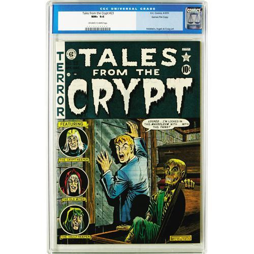 <B>Tales From the Crypt #23 Gaines File pedigree 1/10 (EC, 1951) CGC NM+ 9.6 Off-white to white pages.</B></I> This issue features an Al Feldstein cover with interior art by Feldstein, Graham Ingels, Jack Davis (his first work for this title), and Johnny Craig. A nice book from an important collection. Overstreet 2006 NM- 9.2 value = $865. CGC census 3/06: 5 in 9.6, 1 higher.