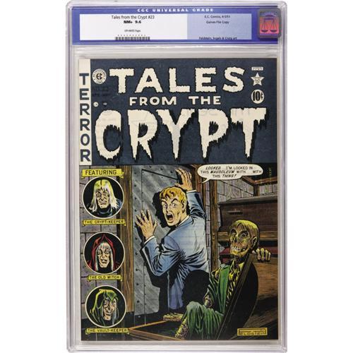 <B>Tales From the Crypt #23 Gaines File pedigree 3/10 (EC, 1951) CGC NM+ 9.6 Off-white pages.</B></I> Attention, Al Feldstein fans: This issue was the last of the series to have Feldstein interior art, reportedly because he was too busy with all of his editing and writing chores for EC. He did continue to contribute covers, though, and this cover's by him as well. Meanwhile, the issue has Jack Davis' first art for this title; it's the story of a businessman who believes that seances are a bunch of nonsensical hocus-pocus until... you'll have to read the story. Also, Johnny Craig contributed art on a tale of two pals who witness a voodoo ritual and live to regret it. The issue also has art by "Ghastly" Graham Ingels. Overstreet 2006 NM- 9.2 value = $865. CGC census 10/06: 6 in 9.6, 1 higher.<BR><BR><b>Shipping:</b> Slabbed Comic (<a target="_blank" href="http://www.heritageauctions.com/common/shipping.php">view shipping information</a>)