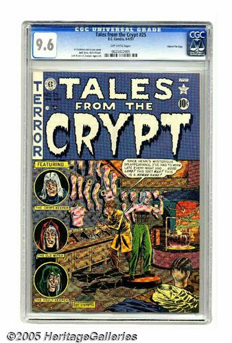 <B>Tales From the Crypt #25 Gaines File pedigree (EC, 1951) CGC NM+ 9.6 Off-white pages.</B></I> This book's Jack Kamen-drawn tale posits a nerd who would do anything to be loved by his dream girl... be careful what you wish for, especially when the story's called "Loved to Death!" Filling out the usual stellar lineup of creators are cover artist Al Feldstein, plus Jack Davis, Wally Wood, and Graham Ingels. Note that while CGC has certified this book as a Gaines File copy, no certificate accompanies this lot. Overstreet 2005 NM- 9.2 value = $810. CGC census 6/05: 4 in 9.6, 1 higher.