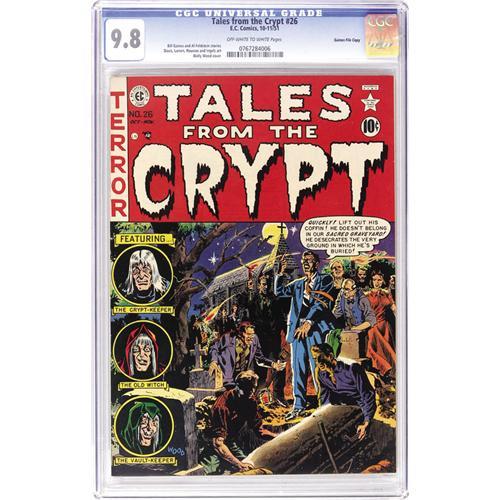 <B>Tales From the Crypt #26 Gaines File pedigree 6/12 (EC, 1951) CGC NM/MT 9.8 Off-white to white pages.</B></I> As of this writing, this is the highest grade that CGC has certified for this issue of EC's most famous and infamous horror series! The book has the distinction of sporting Wally Wood's second cover for EC. The comic's lead story, drawn by Jack Davis, features an artist who thinks he's been underpaid, and in true EC fashion, the guy's got a plan to exact revenge. The issue's other artists include standby Graham Ingels, plus Golden Age stalwarts H. L. Larsen and George Roussos. Overstreet 2006 NM- 9.2 value = $700. CGC census 5/06: 1 in 9.8, none higher. <BR><BR><B>Important notice:</B> Heritage usually auctions material at the rate of 200-250 lots per hour. On some occasions eBay Live bid software or the Internet may not be able to keep up with the pace of the auction. We recommend placing a realistic absentee bid now as insurance to avoid disappointment. Occasionally the auctioneer may eliminate or reject an eBay Live bid, and the auctioneer may also reopen a lot after the close of the eBay live bidding (usually because we missed an audience bid), and may reject your bid even if it shows you as the winning bidder. By bidding via eBay Live, you agree that Heritage may award the lot to another bidder at its sole discretion under the circumstances described above or any other reasonable circumstances. Since eBay bids are not shown to us until we open the lot on the floor, we treat those bids just like floor bids. In most cases the floor responds before the eBay bid is presented to us, due to Internet lag time, so for consistency we have made it a policy that floor bids are always considered first over tie eBay live bids. Also please note that all Heritage lots purchased through eBay Live carry a 22.5% Buyer's Premium. Please make sure you read the Terms and Conditions before you bid. This lot is being auctioned in conjunction with a live floor auction by Heritage Auction Galleries. All final auction and invoice information will be supplied by Heritage Auction Galleries, and all other information should be considered preliminary. Lot:41001 <BR><BR><B>Winning Notification and Billing:</B> After the FINAL session in this auction is complete, Heritage will send e-mail and snail mail invoices. This process normally takes several days. All final auction and invoice information will be supplied by Heritage Auction Galleries, and all other information should be considered preliminary. <BR><BR>This auction will be conducted on a live auction floor and over the Internet through eBay Live. If you choose to place an absentee bid, please take a moment to <font color='#0000ff'><u><a href='http://pages.ebay.com/liveauctions/help/before/laabsentee.html'>learn how eBay Live absentee bidding works</a></u></font><font color='#000000'>