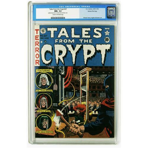 <B>Tales From the Crypt #27 Gaines File pedigree (EC, 1951) CGC NM+ 9.6 Cream to off-white pages.</B></I> This issue has Joe Orlando's first artistic contribution to this series. Orlando drew the story "Madam Bluebeard," featuring a widow whose seven husbands have all met "accidental" deaths, hmm... The issue also has a Wally Wood cover, and interior art by Jack Davis, Graham Ingels, and Jack Kamen. Note that while CGC has certified this book as a Gaines File Copy, no certificate accompanies this lot. CGC notes, "Light tanning (at) bottom of interior front and back cover." Overstreet 2005 NM- 9.2 value = $650. CGC census 12/05: 4 in 9.6, none higher.