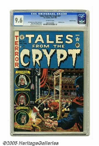 <B>Tales From the Crypt #27 Gaines File pedigree (EC, 1951) CGC NM+ 9.6 Off-white pages.</B></I> This is the first issue of this series to feature Joe Orlando art. Orlando drew the story "Madam Bluebeard," featuring a widow whose seven husbands have all met "accidental" deaths. The issue also has a Wally Wood cover, and interior art by Jack Davis, Graham Ingels, and Jack Kamen. Note that while CGC has certified this book as a Gaines File copy, no certificate accompanies this lot. Overstreet 2005 NM- 9.2 value = $650. CGC census 2/05: 4 in 9.6, none higher.