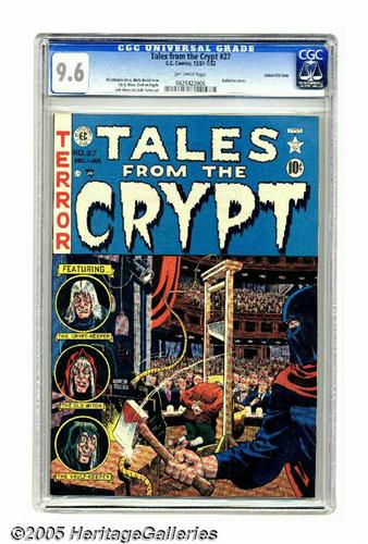 <B>Tales From the Crypt #27 Gaines File pedigree (EC, 1951) CGC NM+ 9.6 Off-white pages.</B></I> This is the first issue of this series to feature Joe Orlando art. Orlando drew the story "Madam Bluebeard," featuring a widow whose seven husbands have all met "accidental" deaths. The issue also has a Wally Wood cover, and interior art by Jack Davis, Graham Ingels, and Jack Kamen. Note that while CGC has certified this book as a Gaines File copy, no certificate accompanies this lot. Overstreet 2005 NM- 9.2 value = $650. CGC census 6/05: 4 in 9.6, none higher.