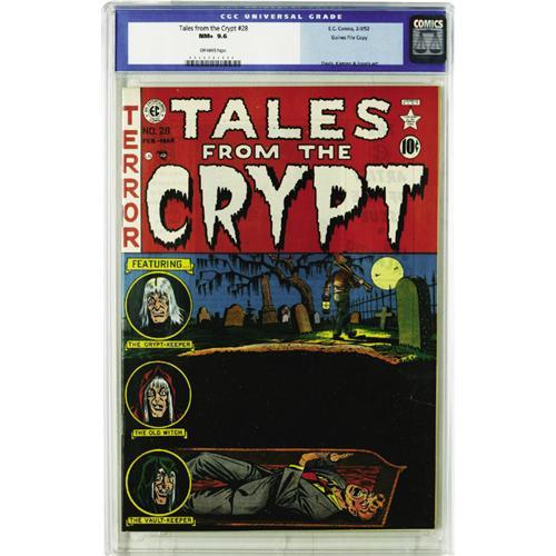 <B>Tales From the Crypt #28 Gaines File pedigree 3/12 (EC, 1952) CGC NM+ 9.6 Off-white pages.</B></I> Al Feldstein's "buried alive" cover is all the hook we needed to get interested in this book, but it's just an appetizer for the corresponding story in the book, drawn by Jack Davis and featuring not just a twist, but a twist on a twist ... The issue also features the artwork of Joe Orlando, Jack Kamen, and Graham Ingels. Overstreet 2006 NM- 9.2 value = $700. CGC census 03/06: 3 in 9.6, none higher.