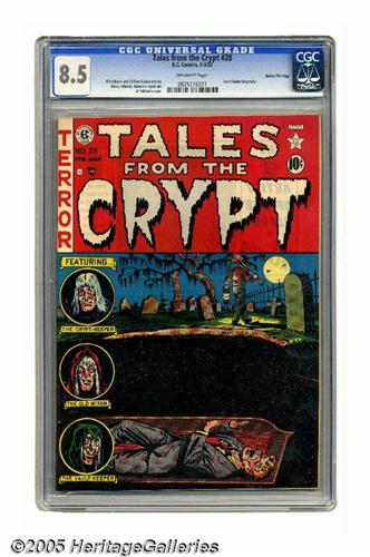 <B>Tales From the Crypt #28 Gaines File pedigree (EC, 1952) CGC VF+ 8.5 Off-white pages.</B></I> Al Feldstein cover. Jack Davis, Joe Orlando, Jack Kamen, and Graham Ingels art. Joe Orlando biography. While CGC verifies this is a Gaines File Copy, no certificate accompanies the lot. Overstreet 2005 VF 8.0 value = $338; VF/NM 9.0 value = $494. CGC census 5/05: 2 in 8.5, 9 higher.