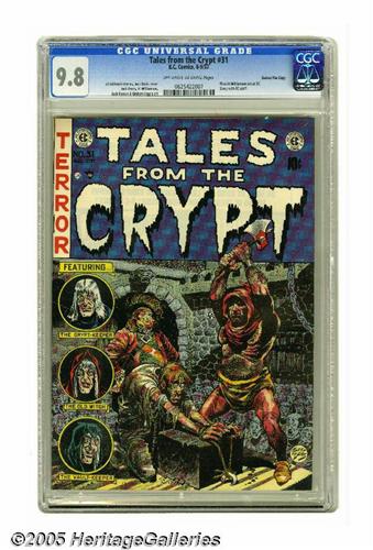 <B>Tales From the Crypt #31 Gaines File pedigree (EC, 1952) CGC NM/MT 9.8 Off-white to white pages.</B></I> This issue features the first artwork Al Williamson did for EC (though another story was published first). The immensely talented Williamson quickly took his place among the company's regulars, and speaking of the EC staff, Bill Gaines and crew make an almost <B>Mad</B></I>-like appearance in a humorous tale drawn by Jack Kamen (and starring Kamen as the main character!). The issue also features the artwork of Jack Davis and Graham Ingels. Images from the issue were used in the book <B>Parade of Pleasure</B></I>. Note that while CGC has certified this book as a Gaines File copy, no certificate accompanies this lot. Overstreet 2005 NM- 9.2 value = $660. CGC census 2/05: 2 in 9.8, none higher.