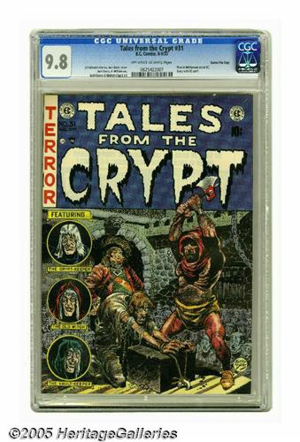<B>Tales From the Crypt #31 Gaines File pedigree (EC, 1952) CGC NM/MT 9.8 Off-white to white pages.</B></I> This issue features the first artwork Al Williamson did for EC (though another story was published first). The immensely talented Williamson quickly took his place among the company's regulars, and speaking of the EC staff, Bill Gaines and crew make an almost <B>Mad</B></I>-like appearance in a humorous tale drawn by Jack Kamen (and starring Kamen as the main character!). The issue also features the artwork of Jack Davis and Graham Ingels. Images from the issue were used in the book <B>Parade of Pleasure</B></I>. Note that while CGC has certified this book as a Gaines File copy, no certificate accompanies this lot. Overstreet 2005 NM- 9.2 value = $660. CGC census 6/05: 3 in 9.8, none higher.